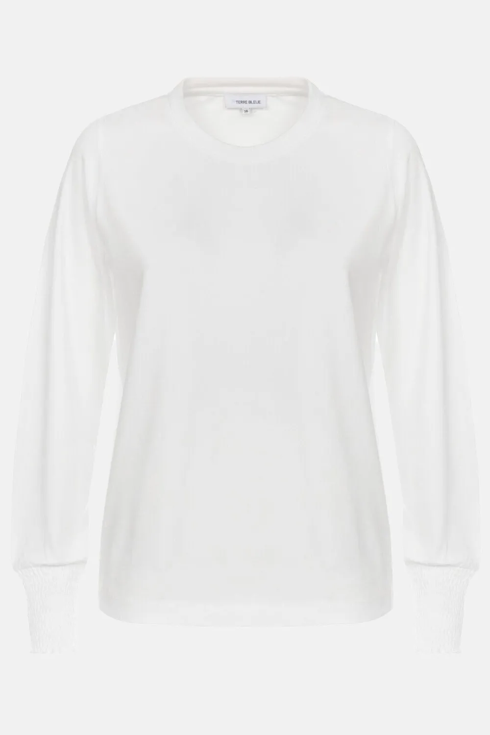 Ecru Dames T-Shirt Met Lange Mouw En Ronde Hals.De Brede Mouwboorden Zijn Versierd Met Smock.Een Comfortabele Katoen- En…