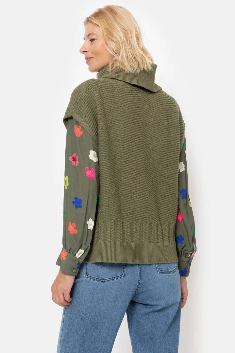 Draag Boven Een Kaki Kleedje Met Multicolor Bloemen.