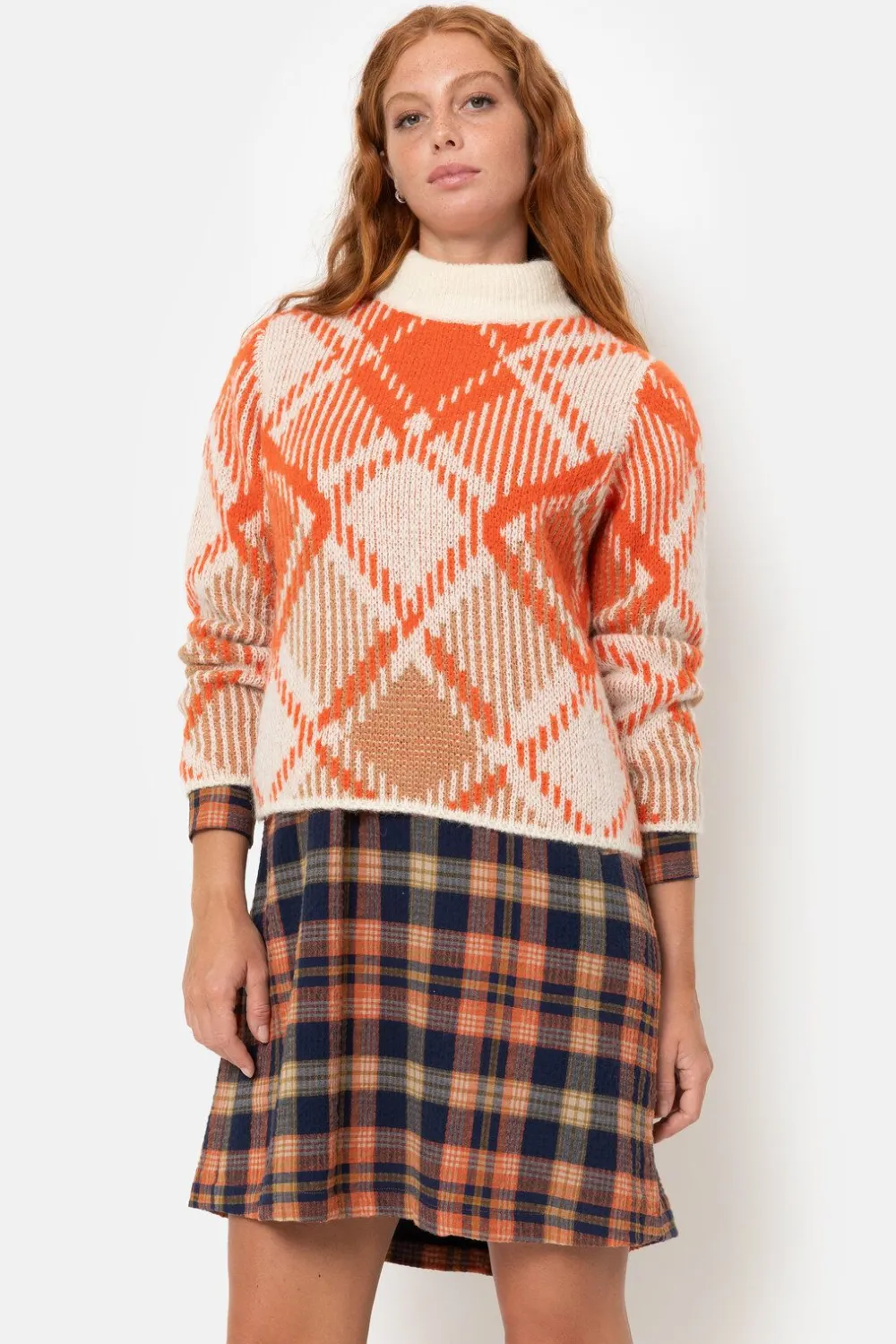 Beige Gebreide Dames Sweater Met Oranje Ruiten.