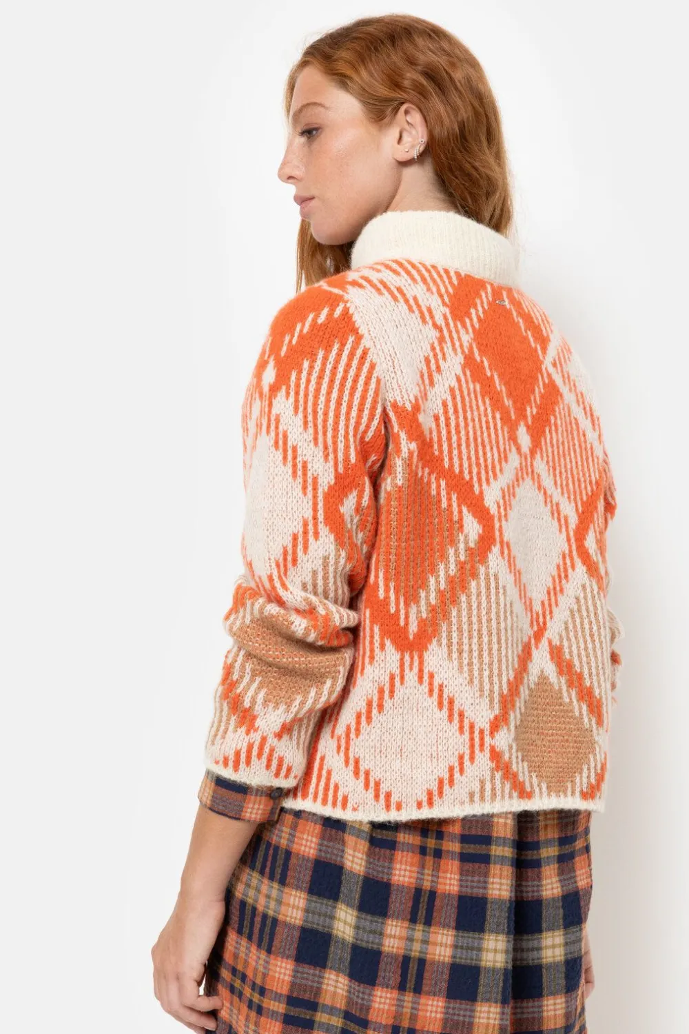Beige Gebreide Dames Sweater Met Oranje Ruiten.Een Elegante Korte Snit Met Een Opstaande Kraag.Match Casual En Chic Met …