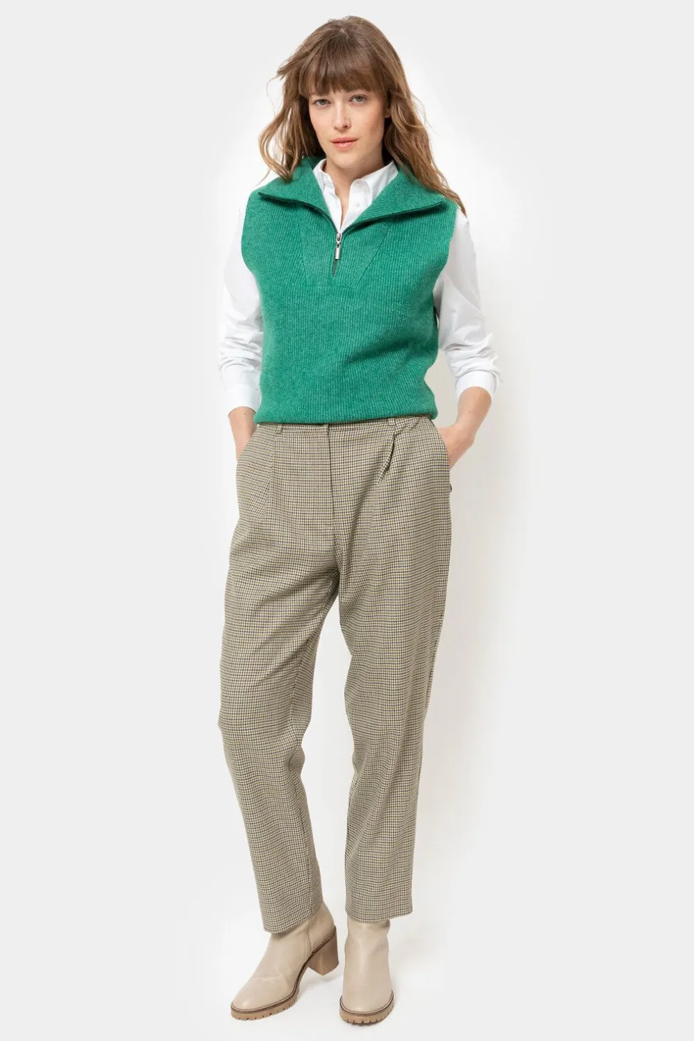 Lichtbruine Damesbroek Met Pied-De-Pouleruitjes.Een Elegante Tapered Fit Met Casual Steekzakken.Stijlvol Met Een Groene …