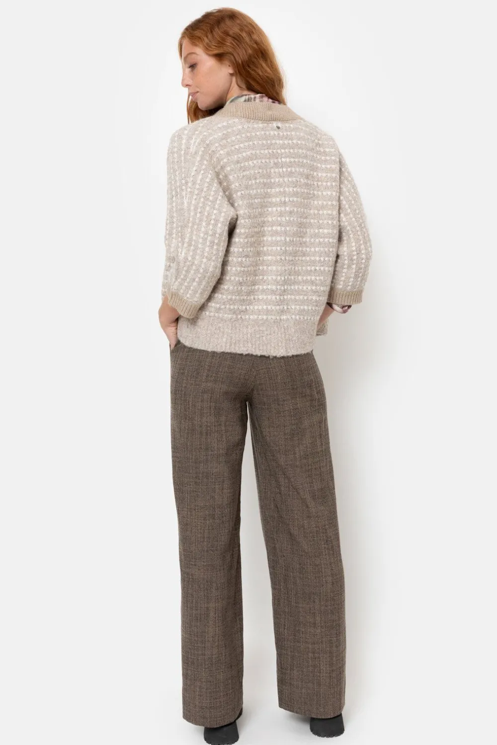 Dames Cardigan In Beige Gestreepte Teddystof.Een Korte, Losjes Vallende Snit Zonder Knopen.Met Effen Kraag, Boorden En M…