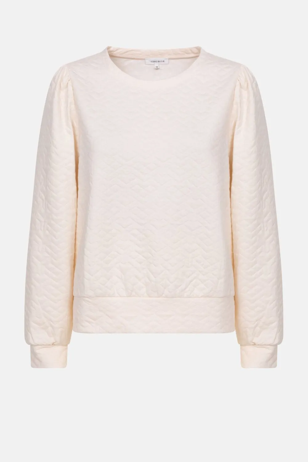 Ecru Damespull Met Een Gestikt Geometrisch Motief.Een Sportieve, Korte Snit Met Lange Pofmouwen.Casual En Chic Met Een B…