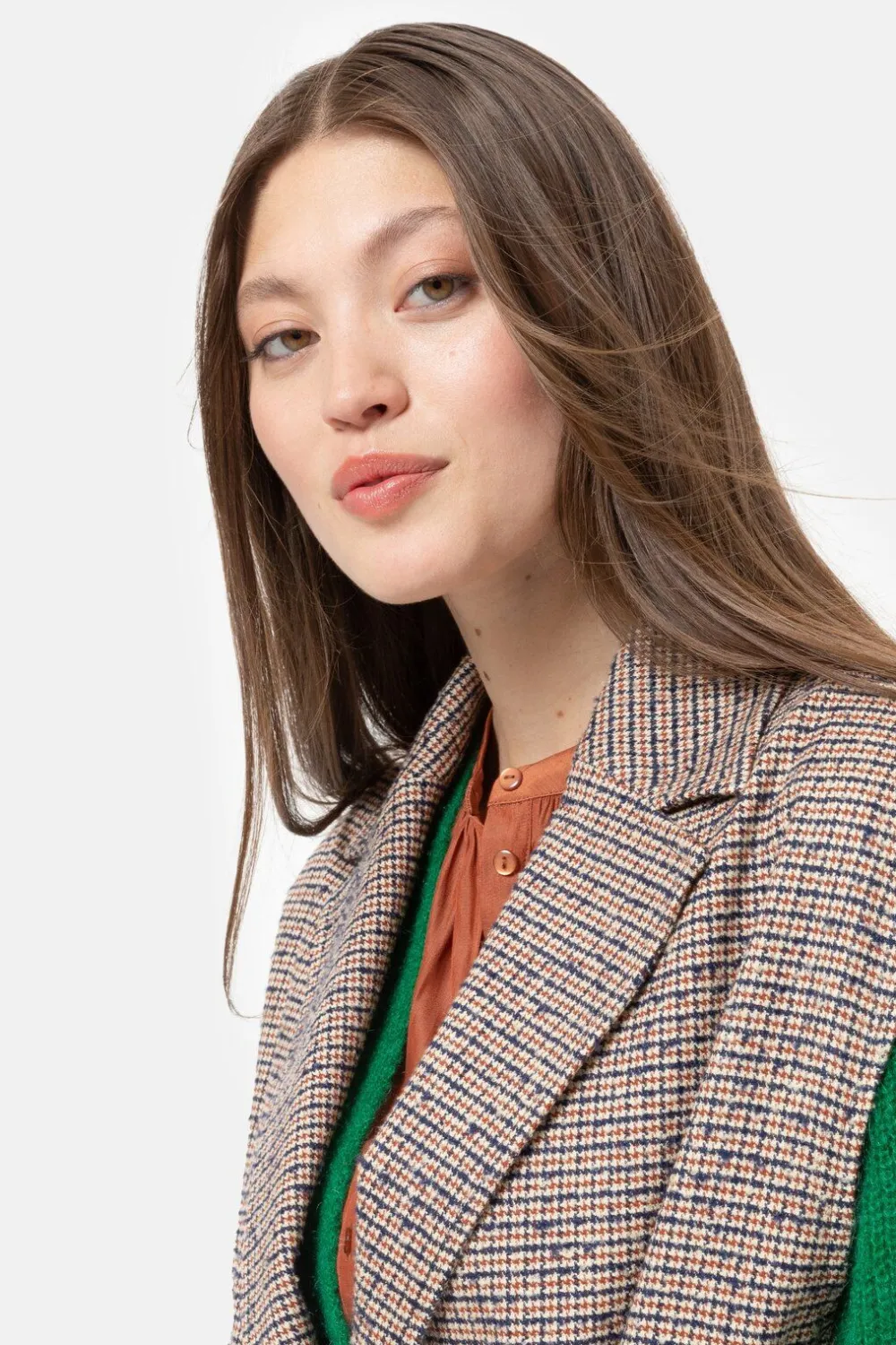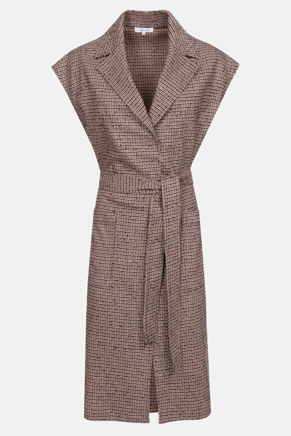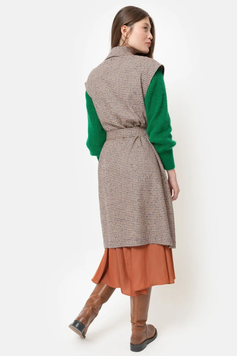 Lange Bruin Geruite Vest Zonder Voering.Met Chique Col Revers En Een Vrouwelijk Taillelint.Match Met Een Lange Bruine Ju…