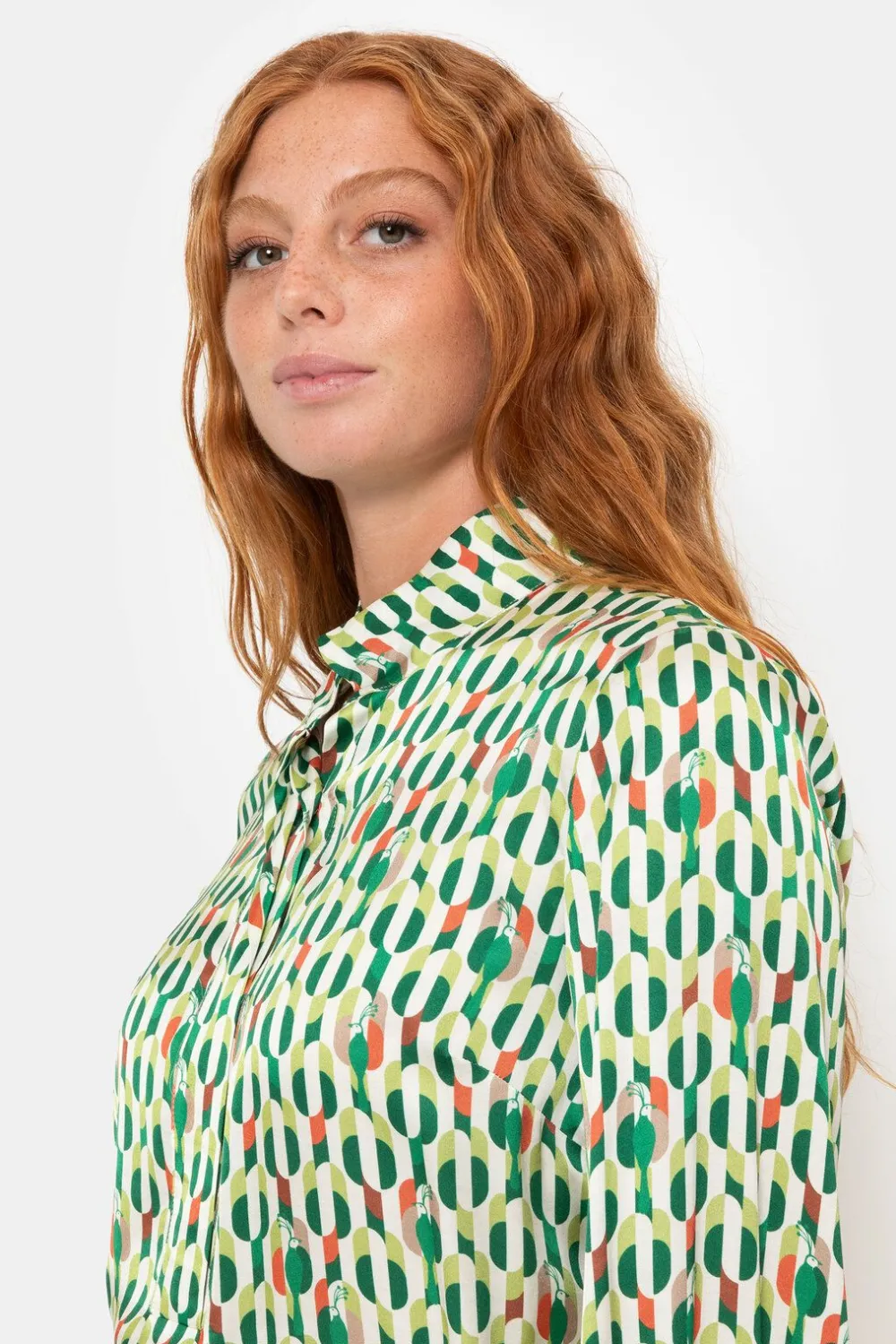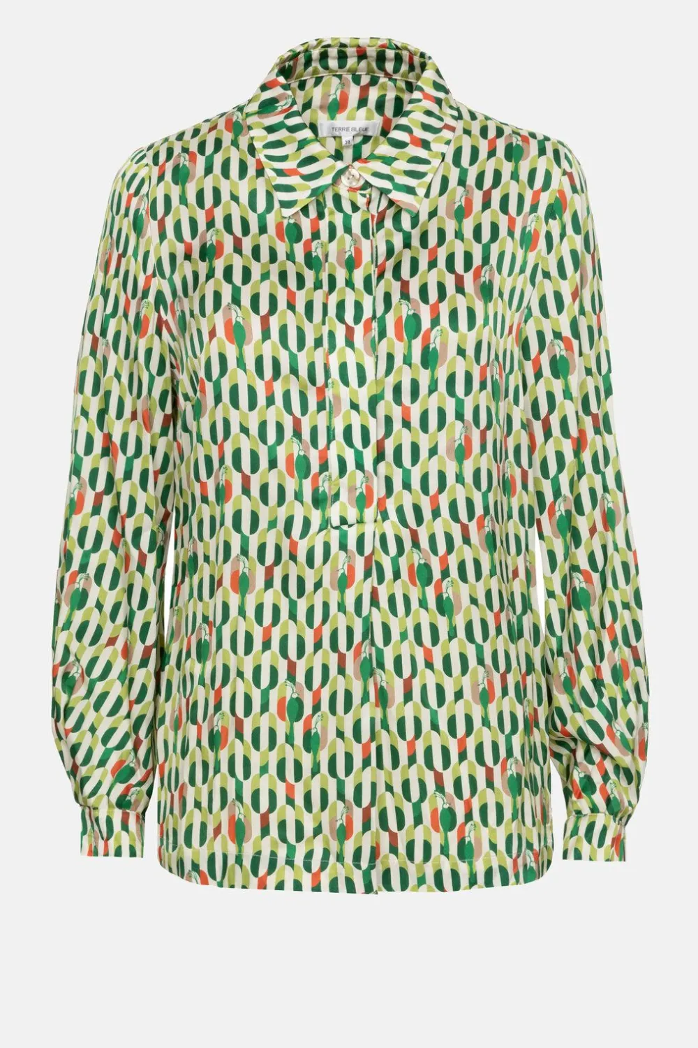 Groene Dames Blouse In O.A. Ecovero Viscose.Een Subtiel Glanzende Snit Met Een Retroprint.Losse, Rechte Mouwen En Twee B…