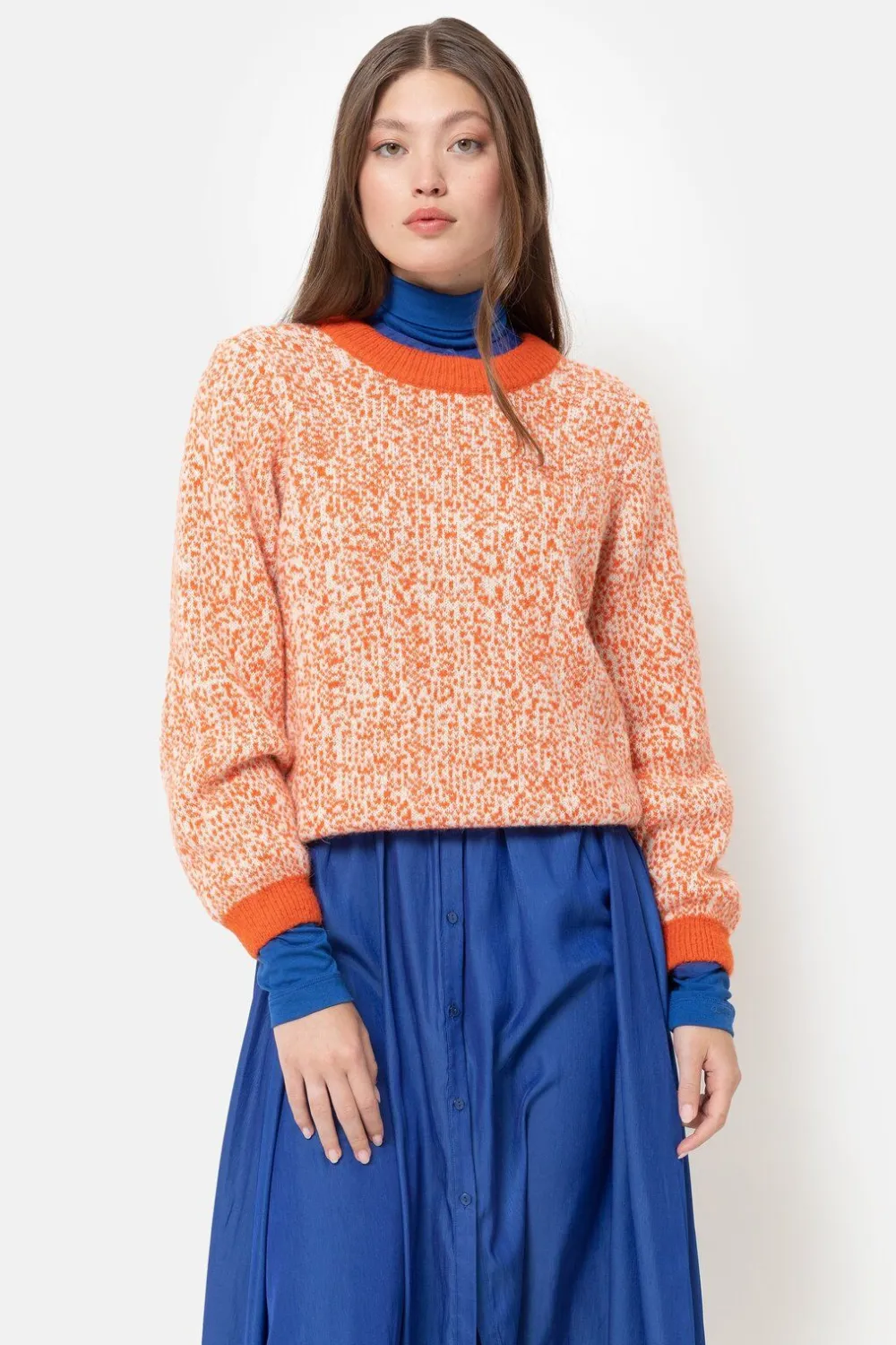 Gebreide Trui Met Een Oranje Gespikkeld Motief.Een Modieuze Boxysnit Met Lange Pofmouwen.Een Elegante, Ronde Hals En Eff…