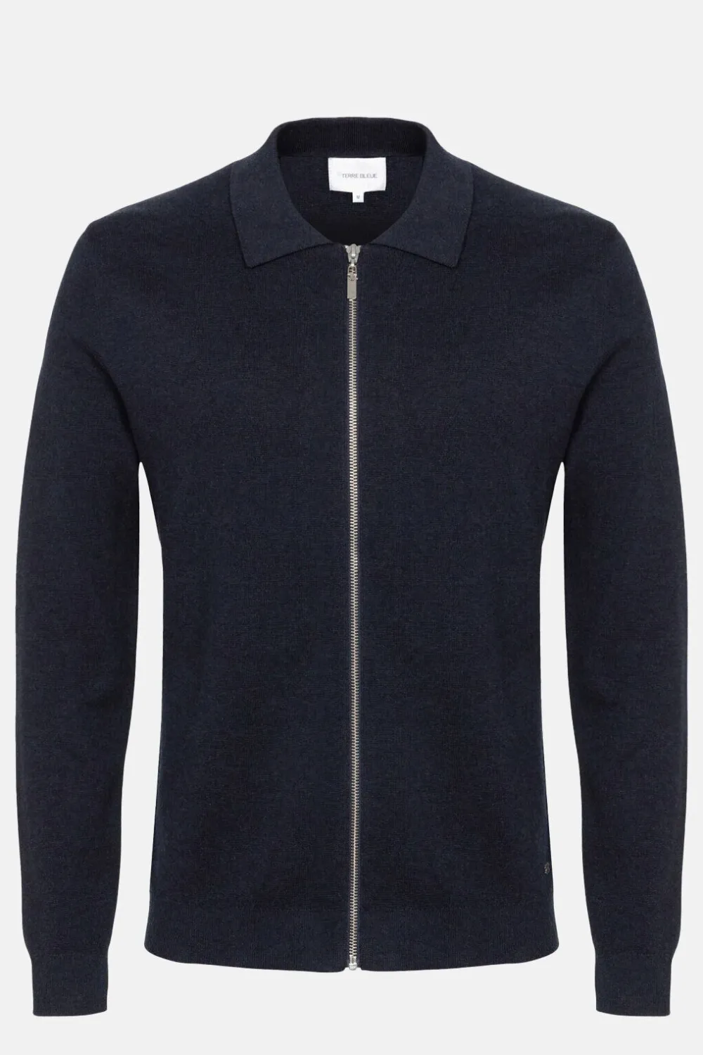 Donkerblauwe Heren Cardigan In 100% Katoen.Stevig Tricot Met Een Geklede Polokraag.En Een Sportieve Zilveren Ritssluitin…