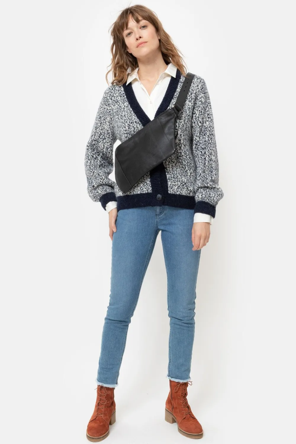 Match Met Een Ecru-Blauw Gilet En Een Cropped Jeans.