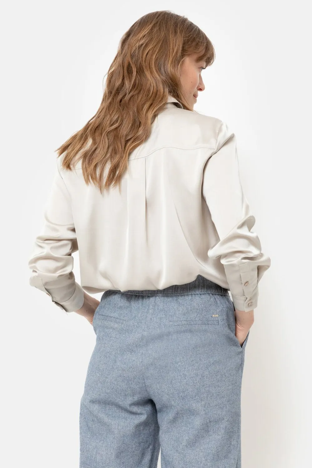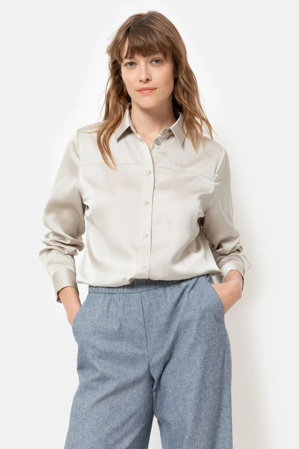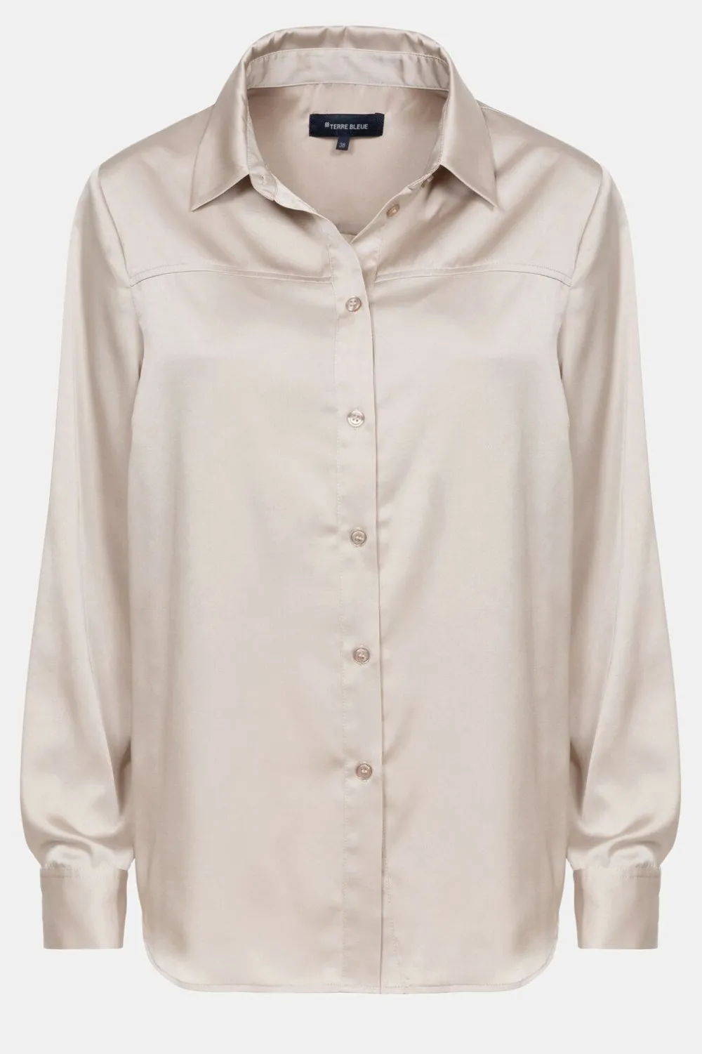 Beige Damesblouse In Een Soepele Glansstof.Met Een Klassieke Hemdkraag En Beige Knoopjes.Mooi Onder Een Blauw-Beige Geme…