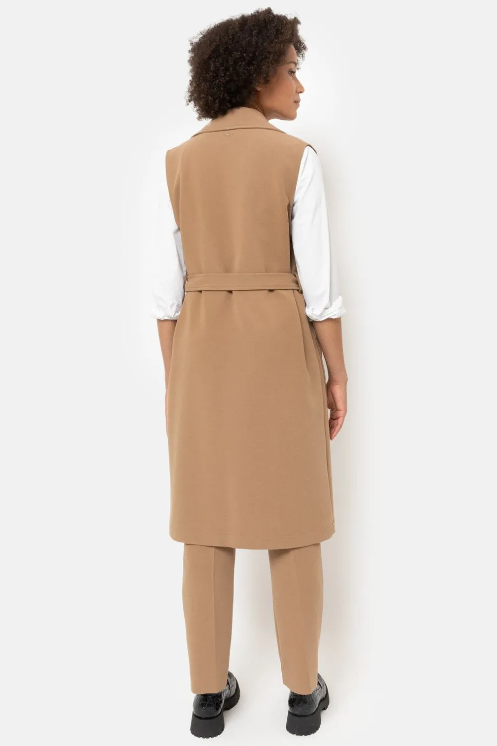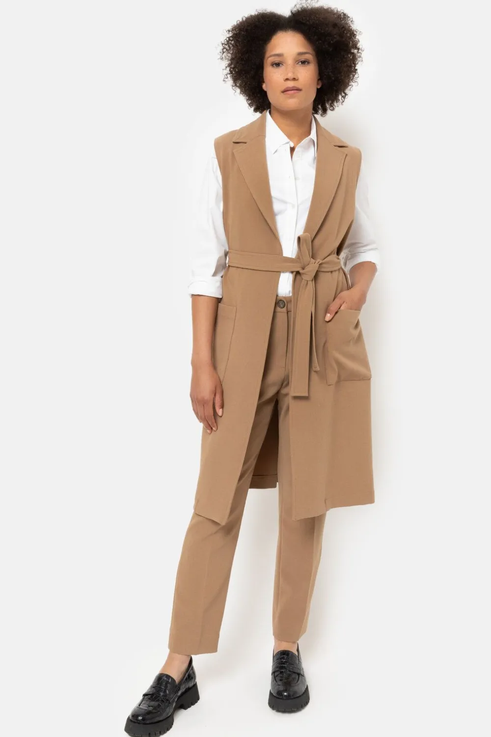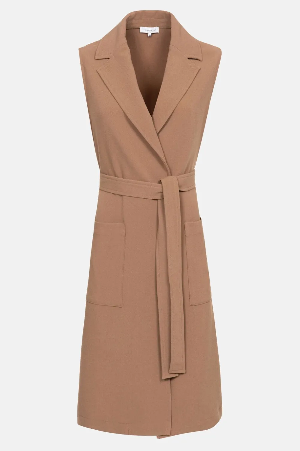 Lange Lichtbruine Damesblazer Zonder Mouwen.Met Een Elegant Taillelint En Twee Grote Opzetzakken.Draag Als Trendy Two-Pi…