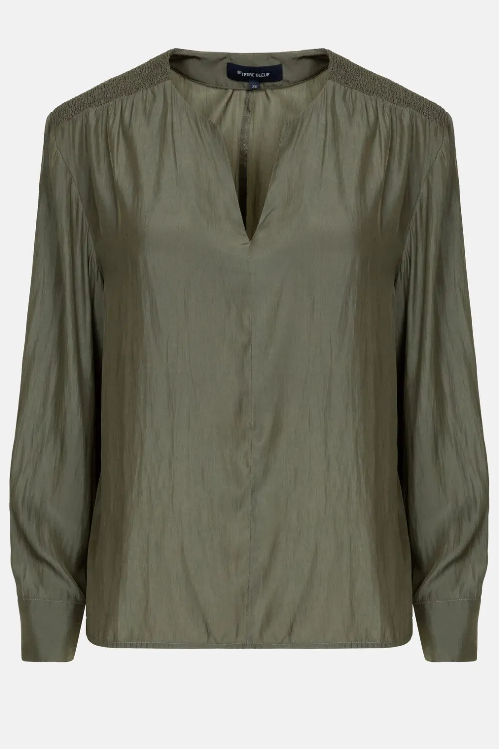 Kakigroene Blouse In Een Fijne, Soepelvallende Stof.Met Smock Op De Schouders En Elegante Manchetten.En Een Ronde Hals M…