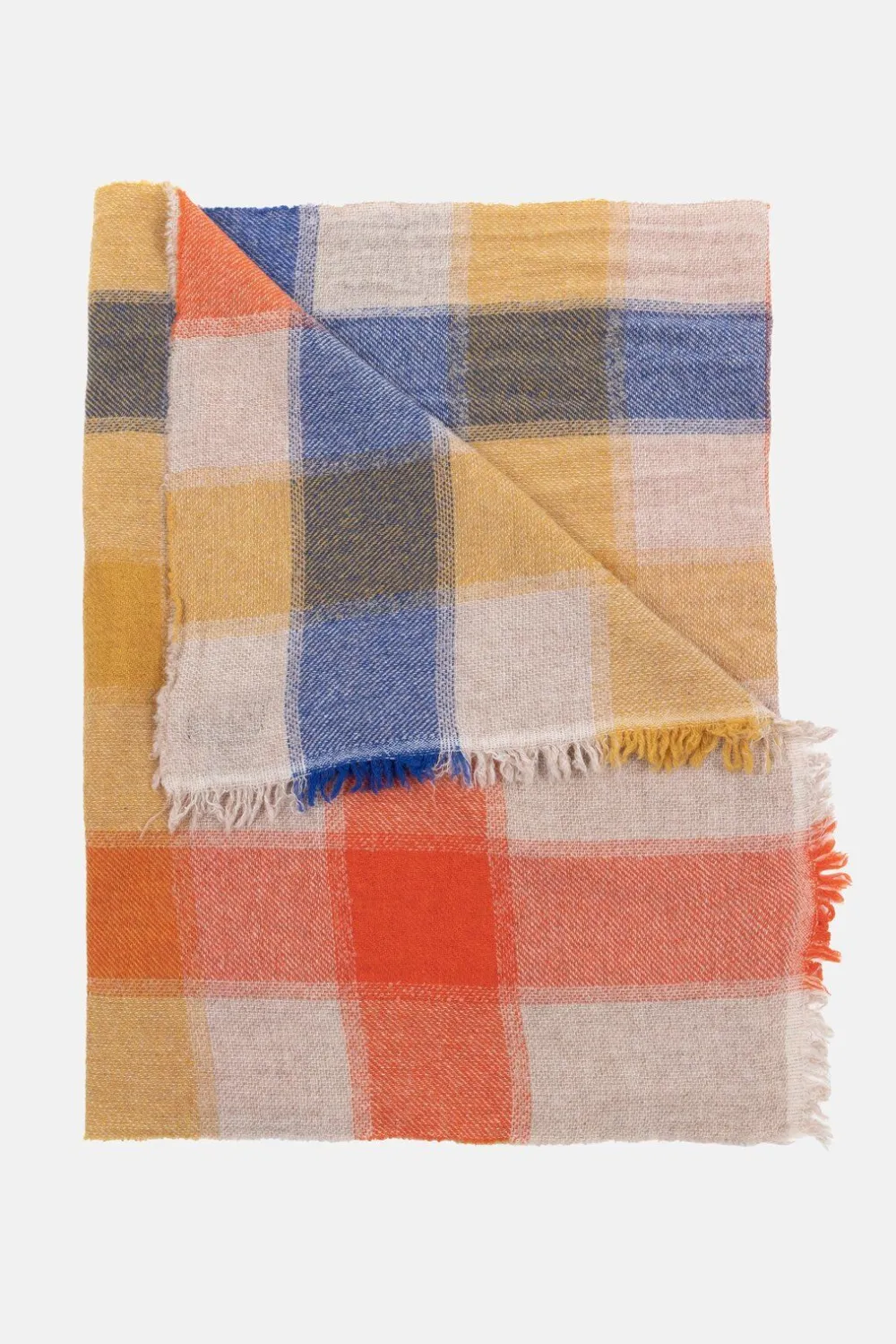 Wintersjaal Voor Dames In Een Fijne Wolmix.Met Een Ruitenpatroon In Beige, Blauw, Oranje, …En Fijne Franjes Aan De Uit…