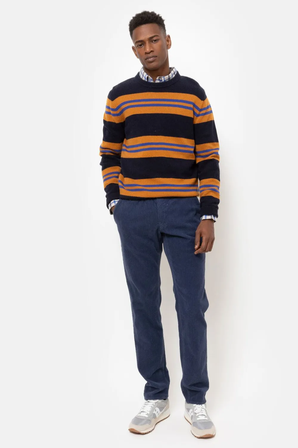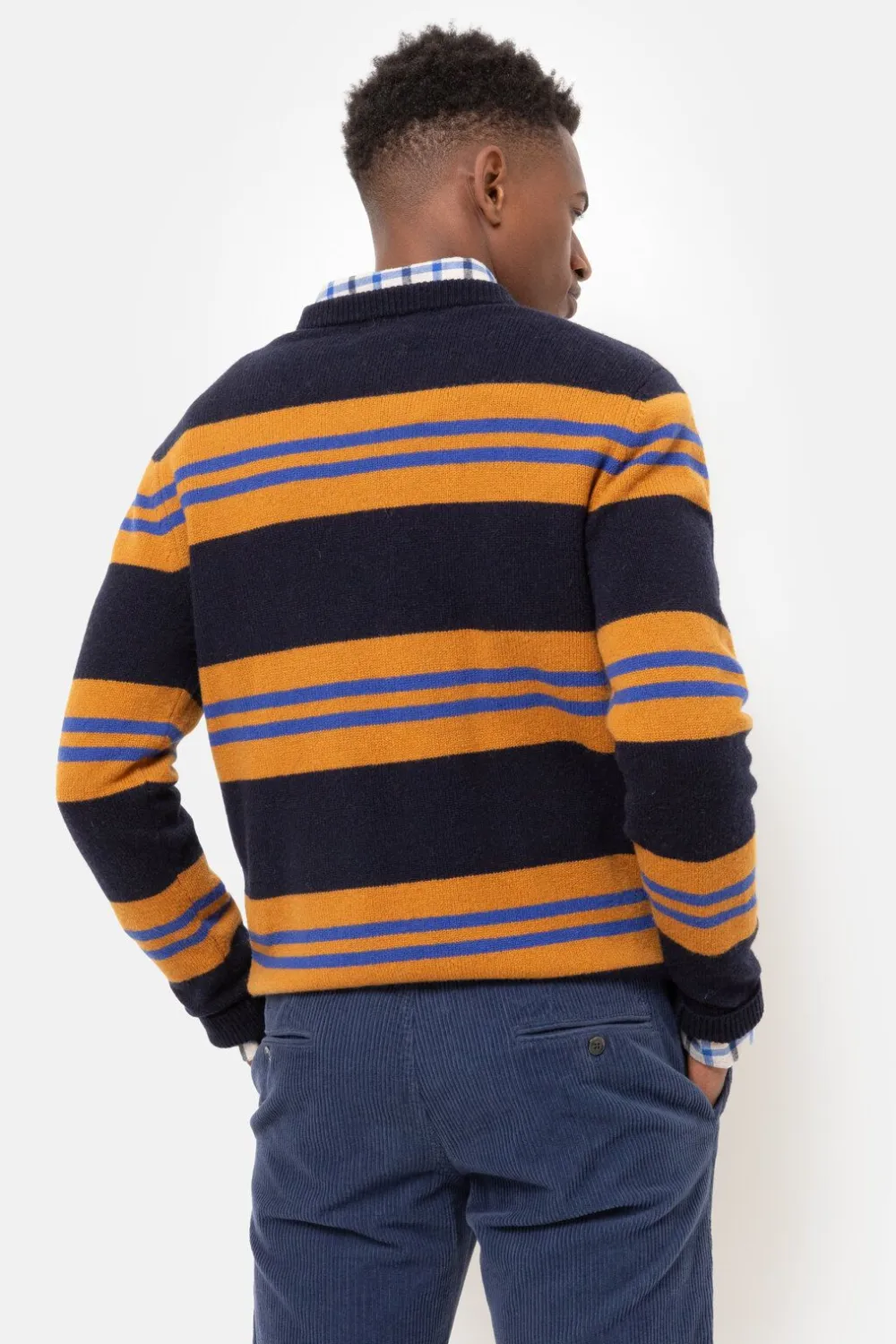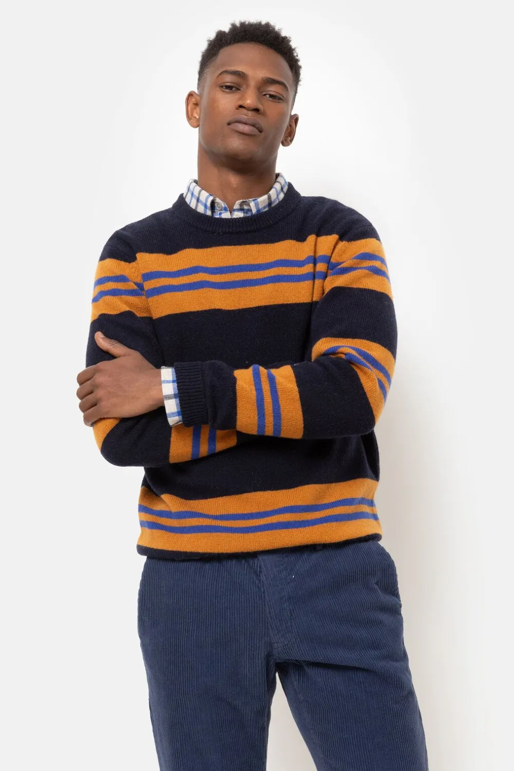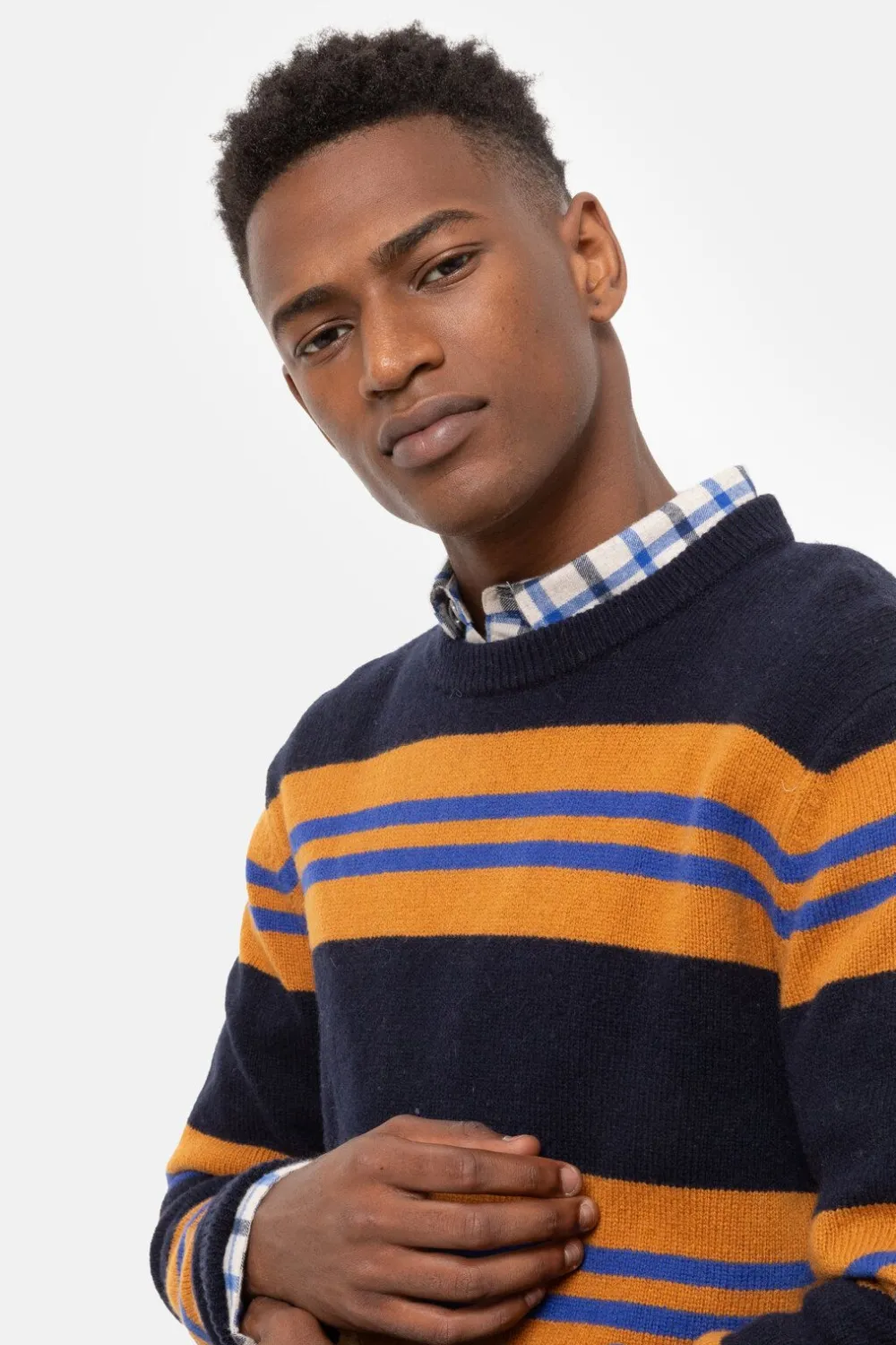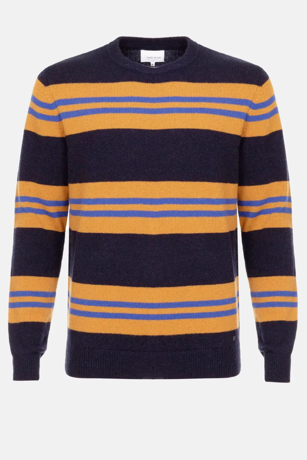 Gebreide Mannensweater In Wol En Gerecyclede Stof.Lossere Fit Met Brede Bruine En Fijne Blauwe Strepen.Match Trendy Met …