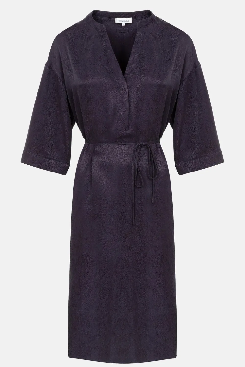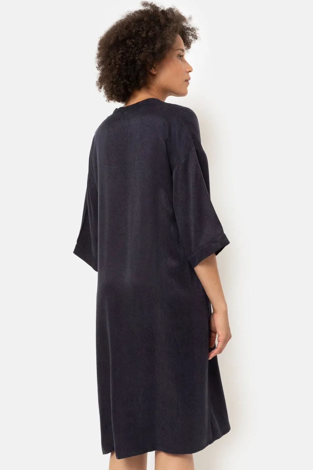 Navyblauw Halflang Kleedje In Lyocell En Cupro.Met Heel Fijne, Glanzende Streepjes In De Stof.Een Losse, Elegante Snit M…
