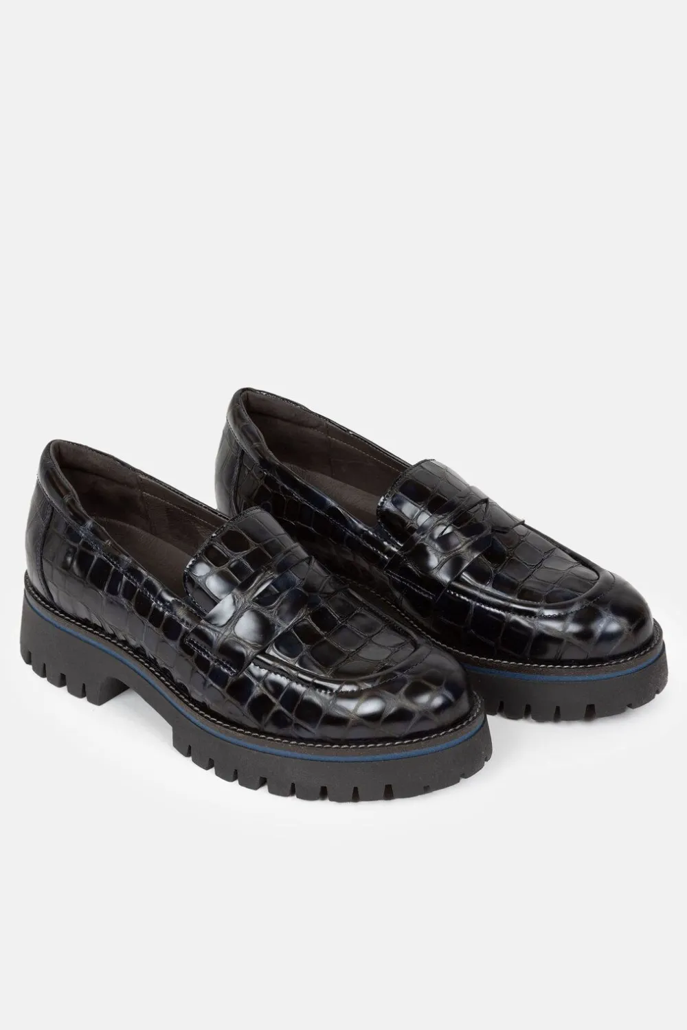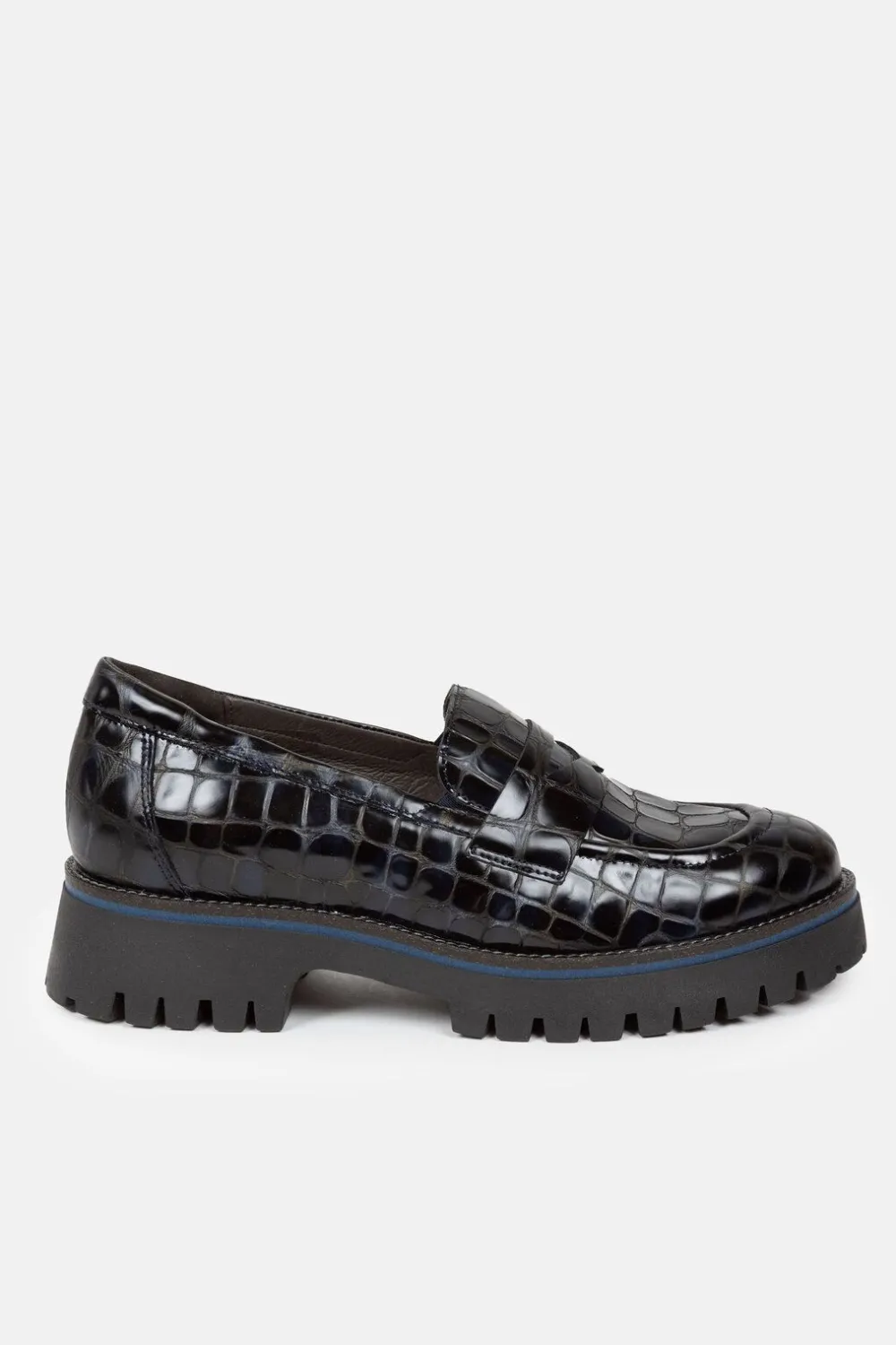 Zwart-Blauwe Instappers In 100% Lakleder.Met Een Chic Glanzende Crocolook.Een Zwarte Chunky Zool En Een Elegante Lederen…