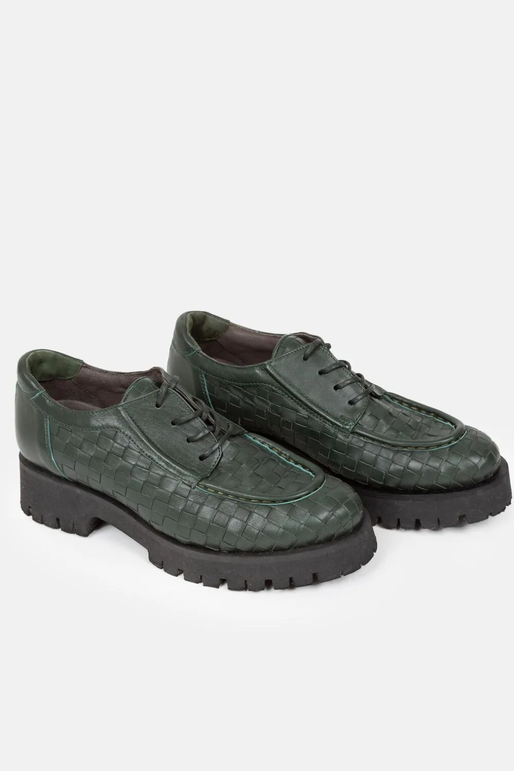 Groene Damesschoenen In 100% Leder.Met Een Matte Crocolook En Zwarte Veters.En Een Zwarte Chunky Zool Met Een Stevige, L…