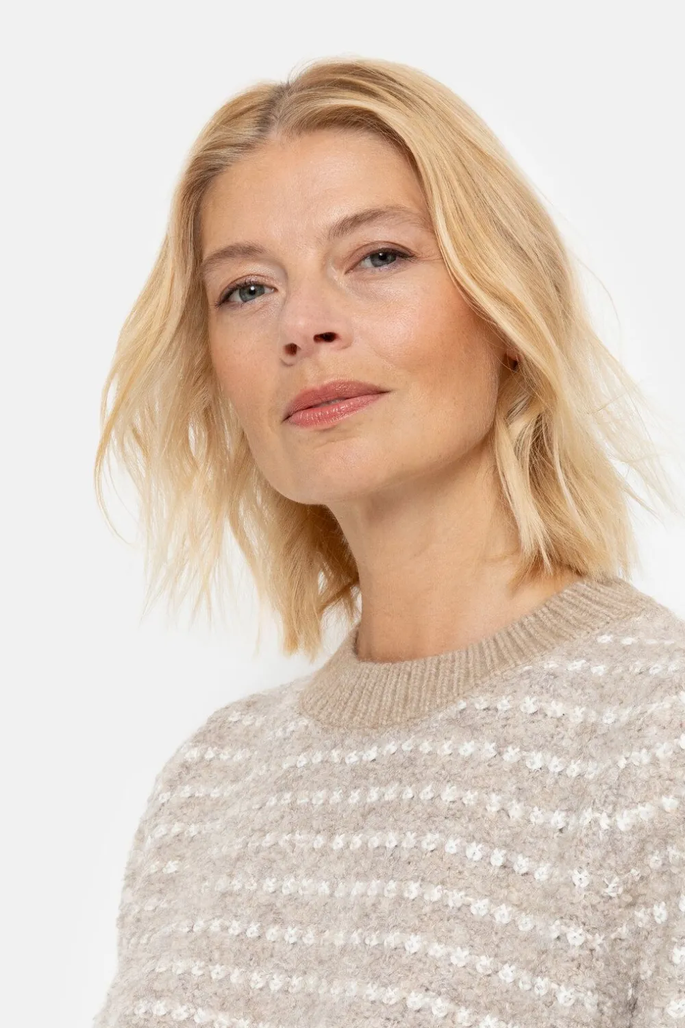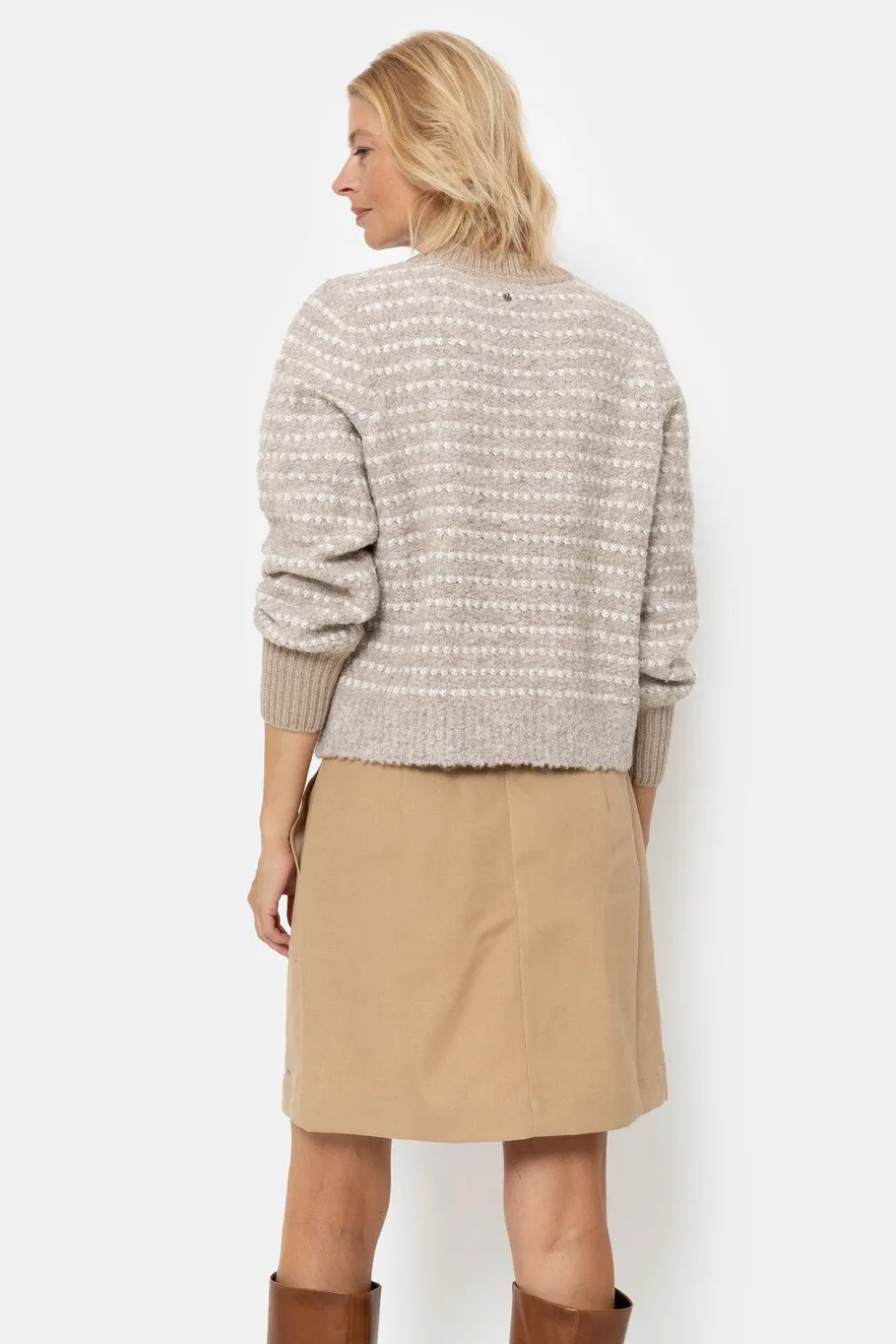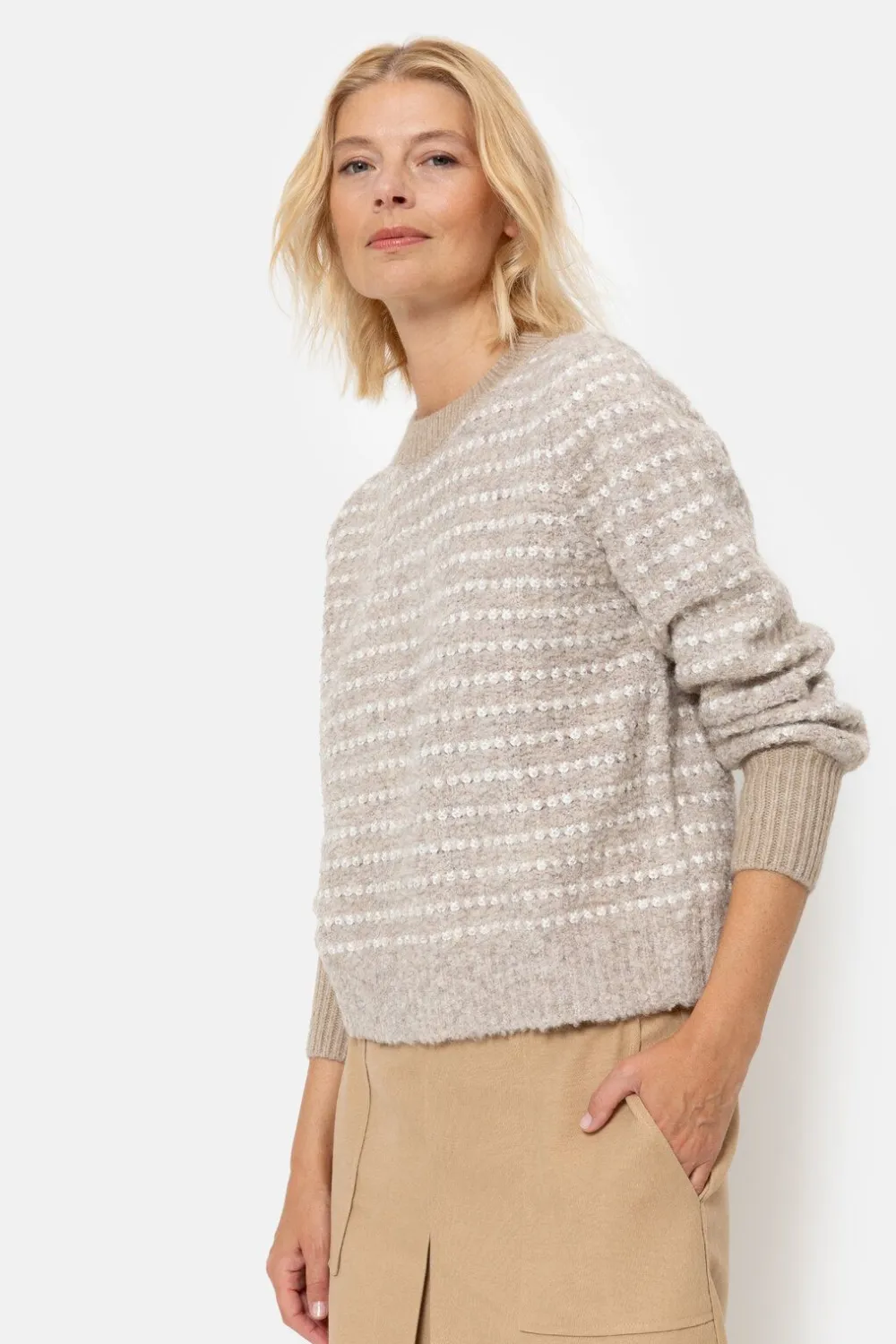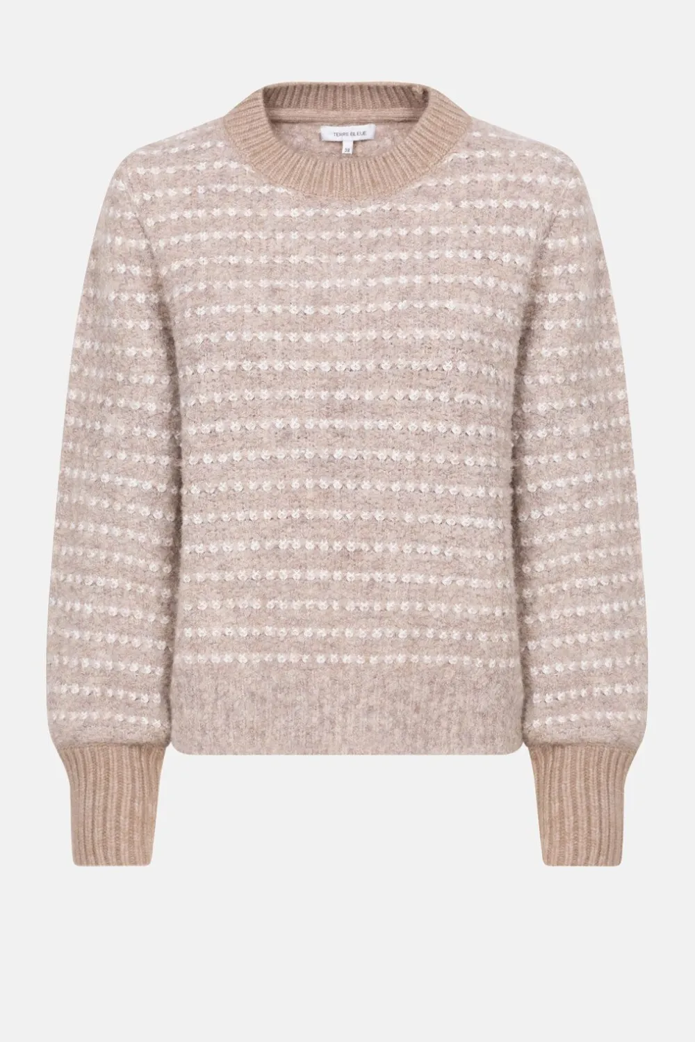 Beige Zeer Zacht Gebreide Dames Sweater In Teddy.Met Ecru Strepen En Effen Ecru Boorden.Casual En Chic Boven Een Korte L…