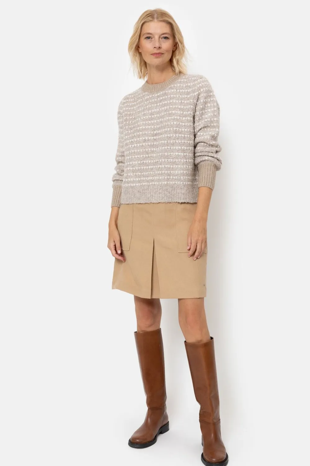 Casual En Chic Boven Een Korte Lichtbruine Rok.