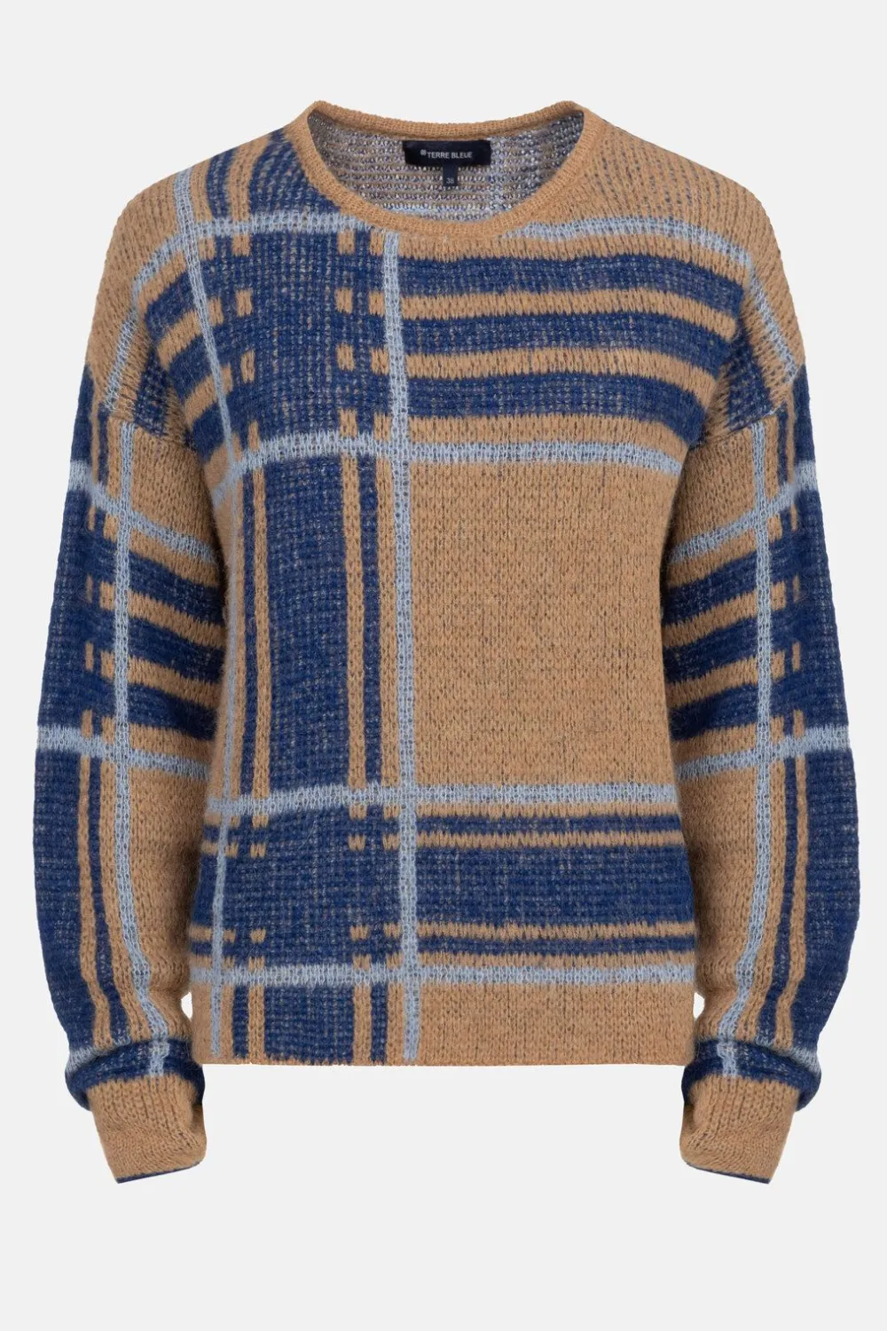 Lichtbruine Gebreide Trui In Een Zachte Wolmix.Met Asymmetrische Blauwe Strepen En Color Blocks.Een Elegante Boothals En…