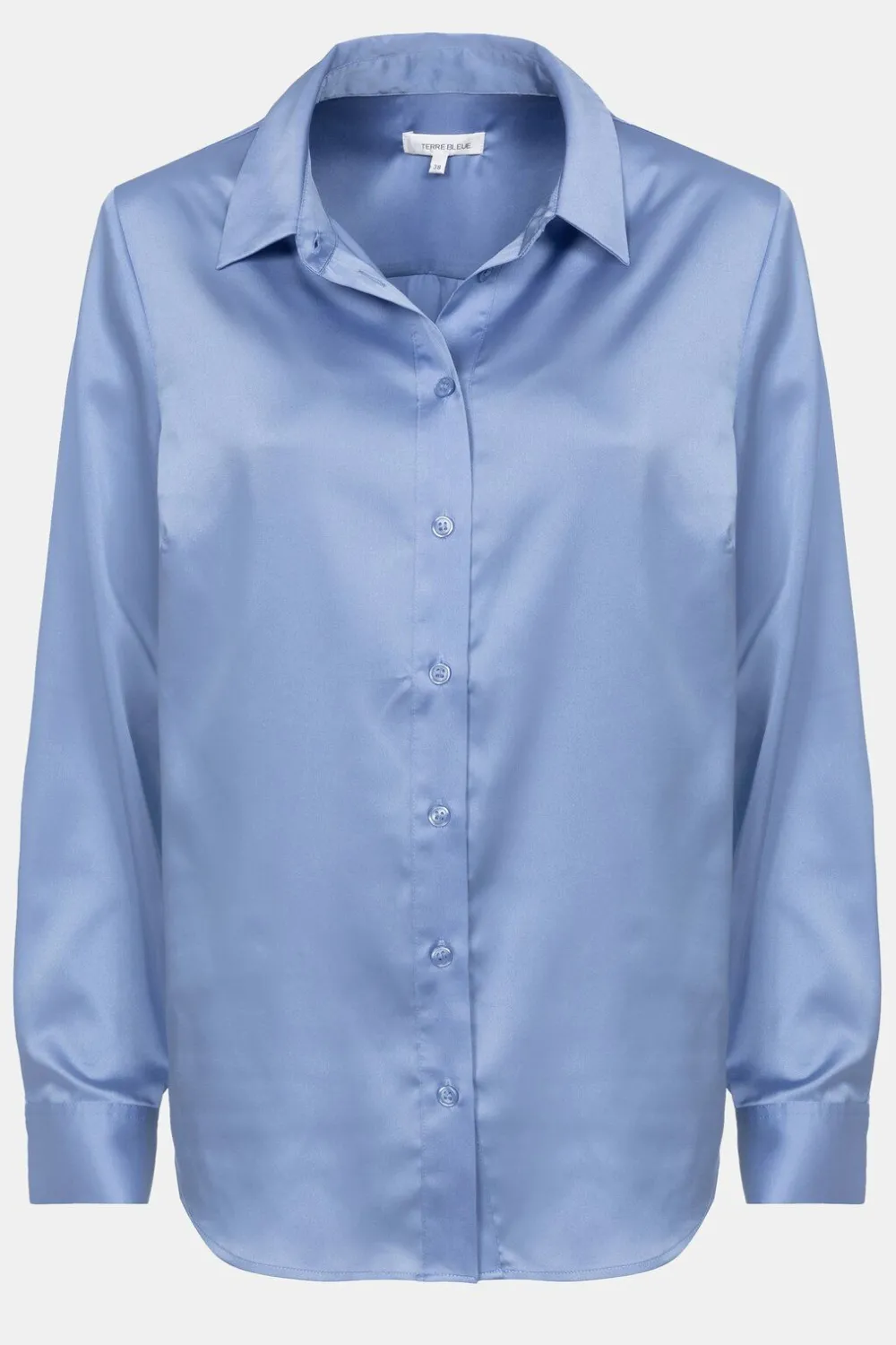 Lichtblauwe Damesblouse In Een Soepele Glansstof.
