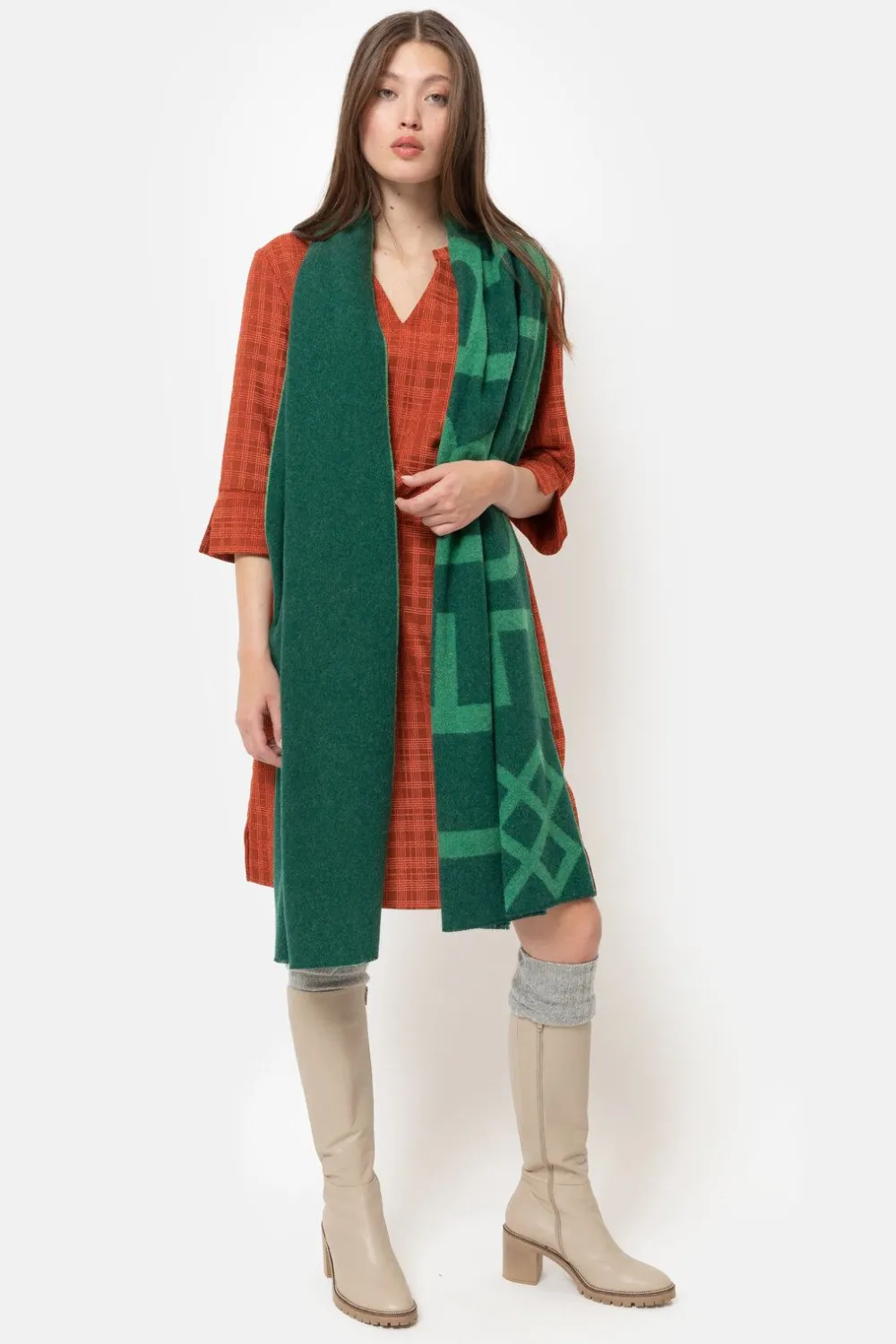 Donkergroene Sjaal In Een Fijn Geweven Wolmix.Met Een Chic Ingeweven Geometrisch Dessin.Match Stijlvol Met Een Oranje-Br…