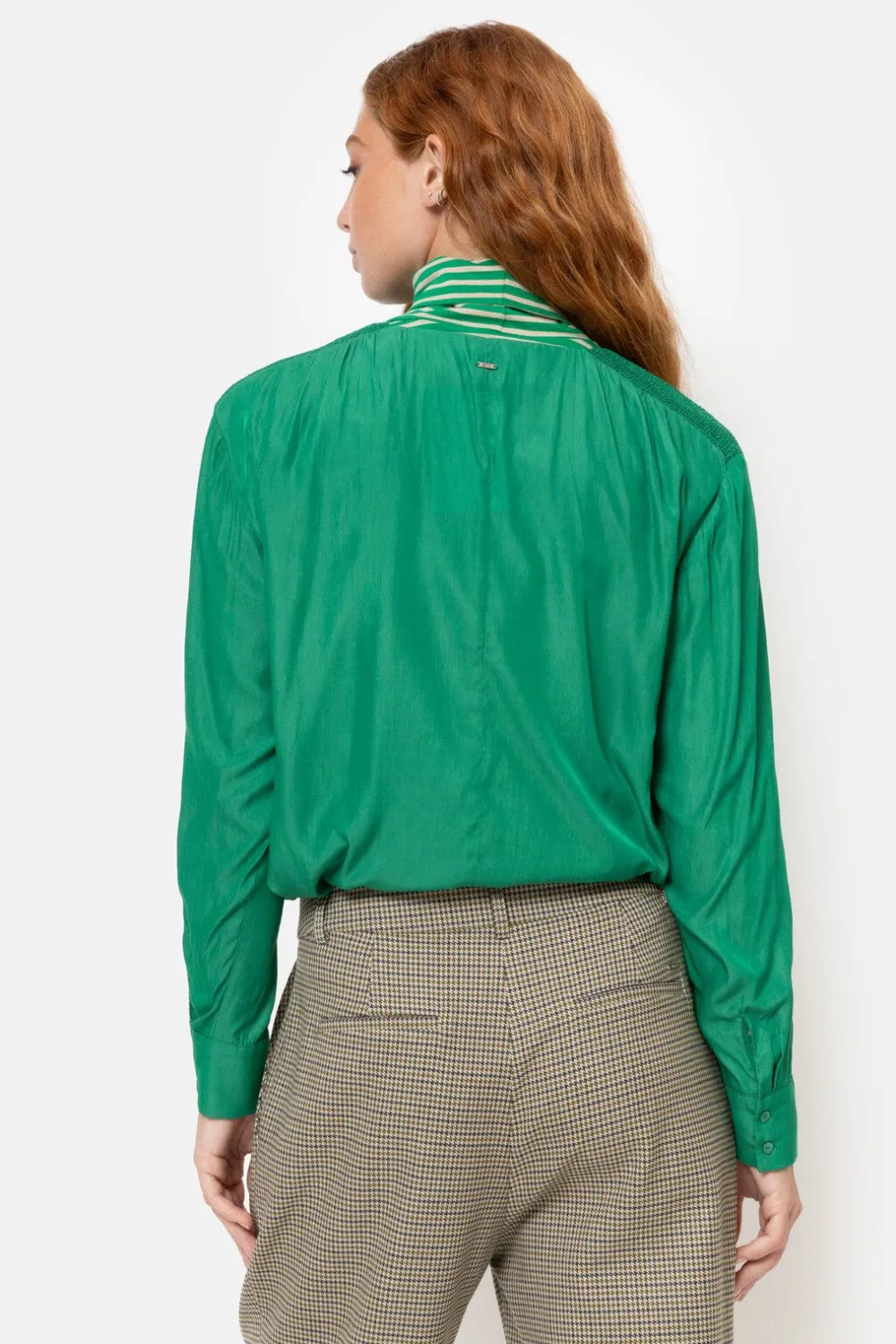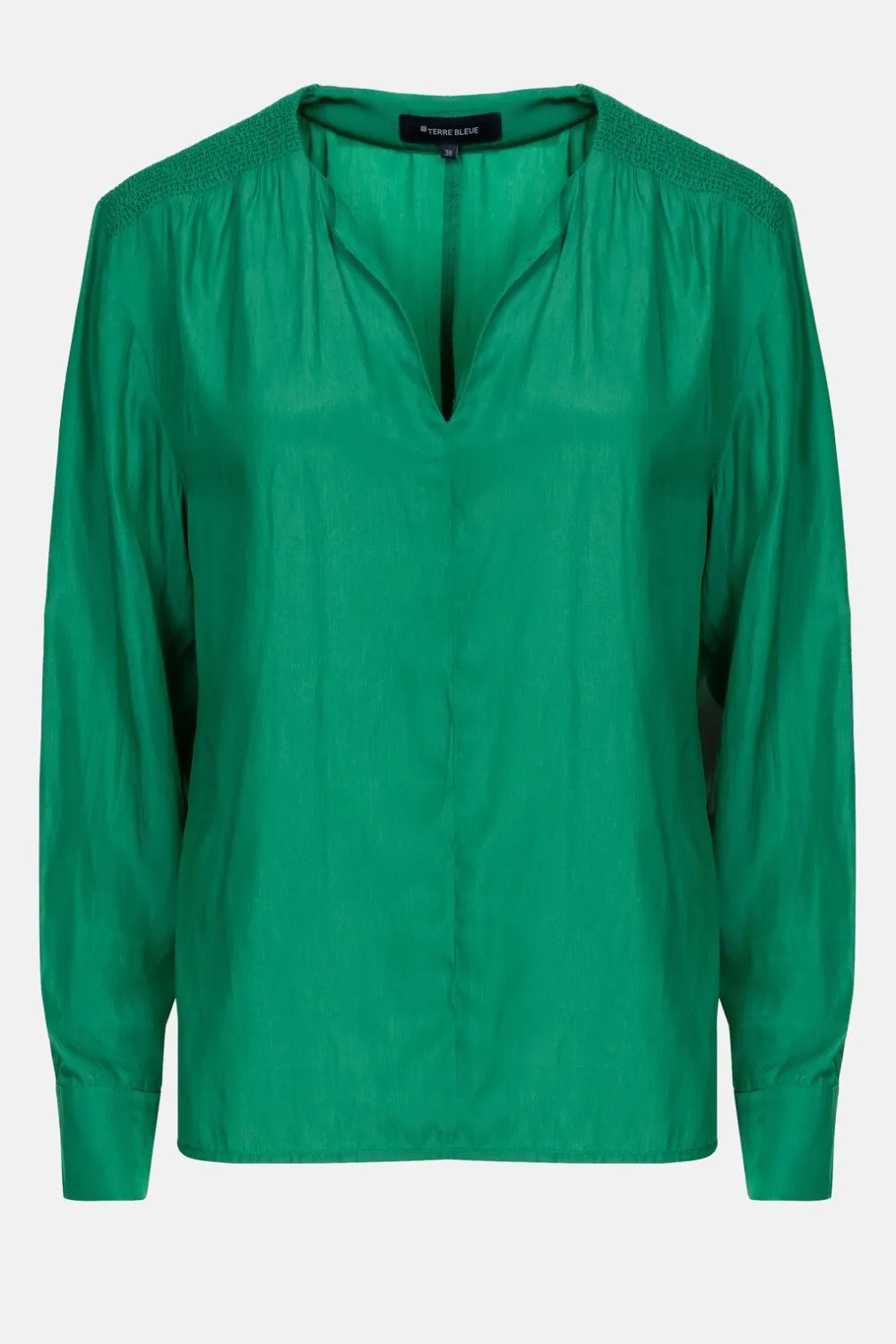 Groene Blouse In Een Fijne, Soepelvallende Stof.Met Smock Op De Schouders En Elegante Manchetten.En Een Ronde Hals Met S…