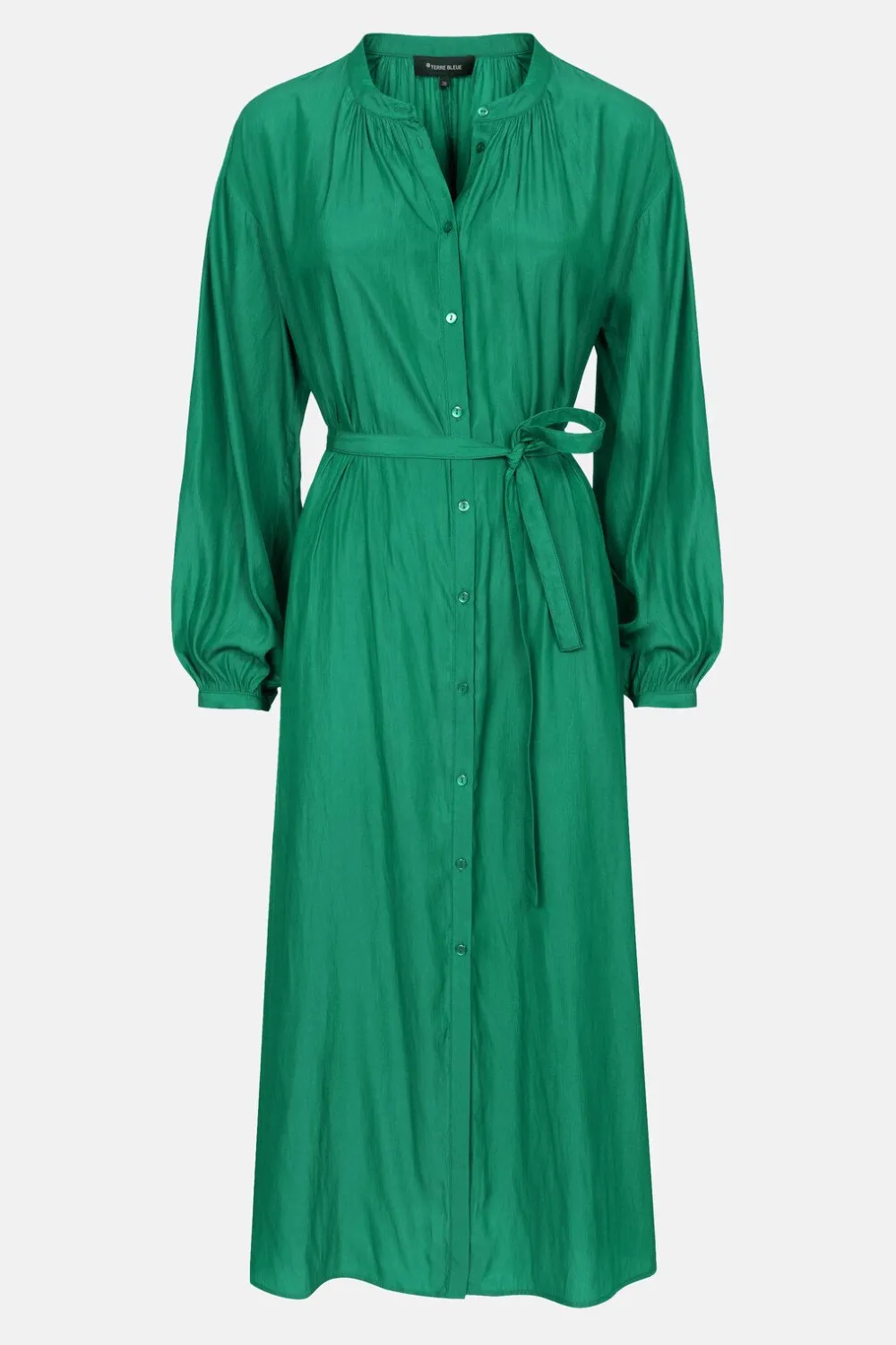 Groen Lang Kleedje In Een Fijne, Zwierige Stof.Met Groene Knoopjes En Een Elegant Taillelint.Lange Mouwen En Een Maokraa…