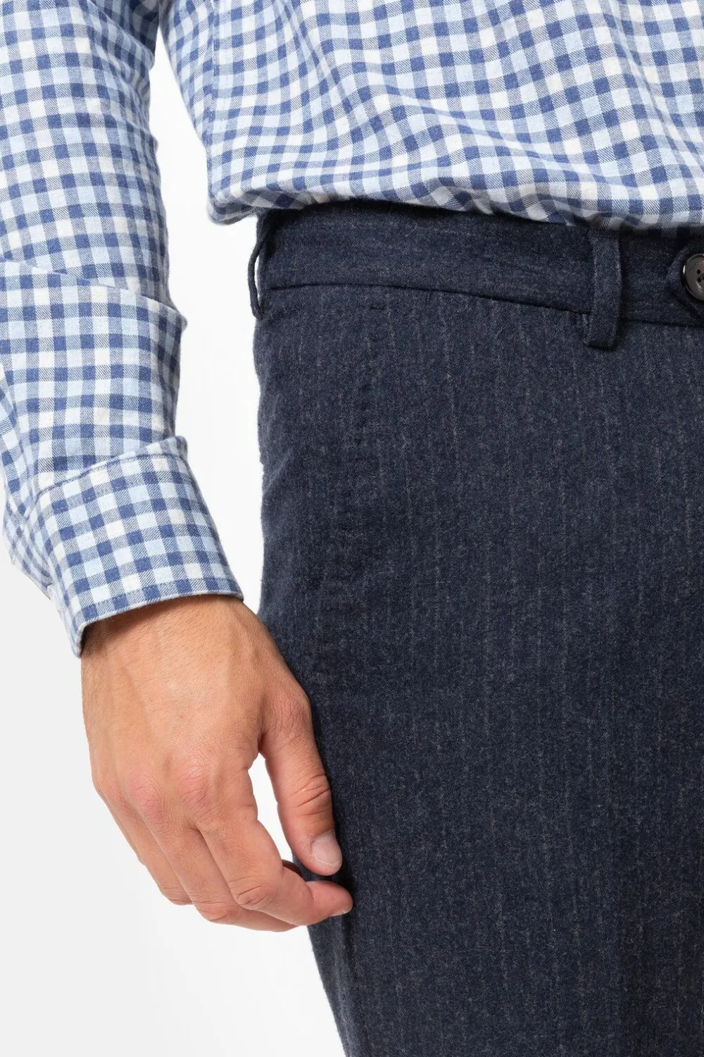 Donkerblauwe Herenbroek In Een Zeer Zachte Wolmix.Een Iets Meer Nauwsluitende Snit Met Zijzakken.Een Subtiele Krijtstree…