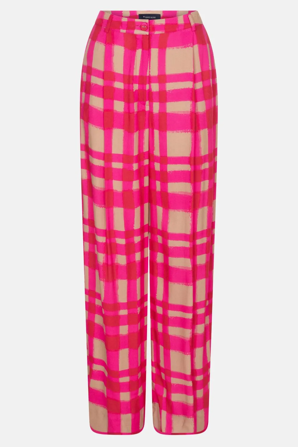 Roze-Camel Damesbroek In 100% Soepel Viscose.Met Elegante, Wijde Broekspijpen En Een Bandplooi.Trendy Met Een Fuchsia Ge…