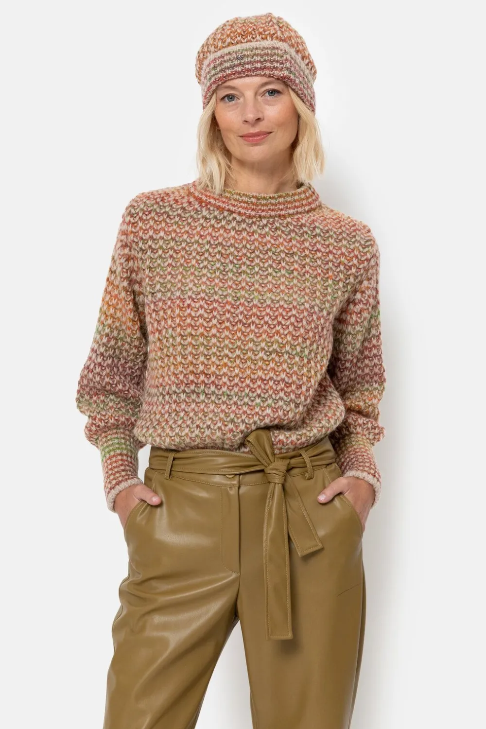 Gebreide Muts Voor Dames, In Een Zachte Wolmix.Met Beige-Bruine Strepen En Groen-Oranje Accenten.Combineer Stijlvol Met …