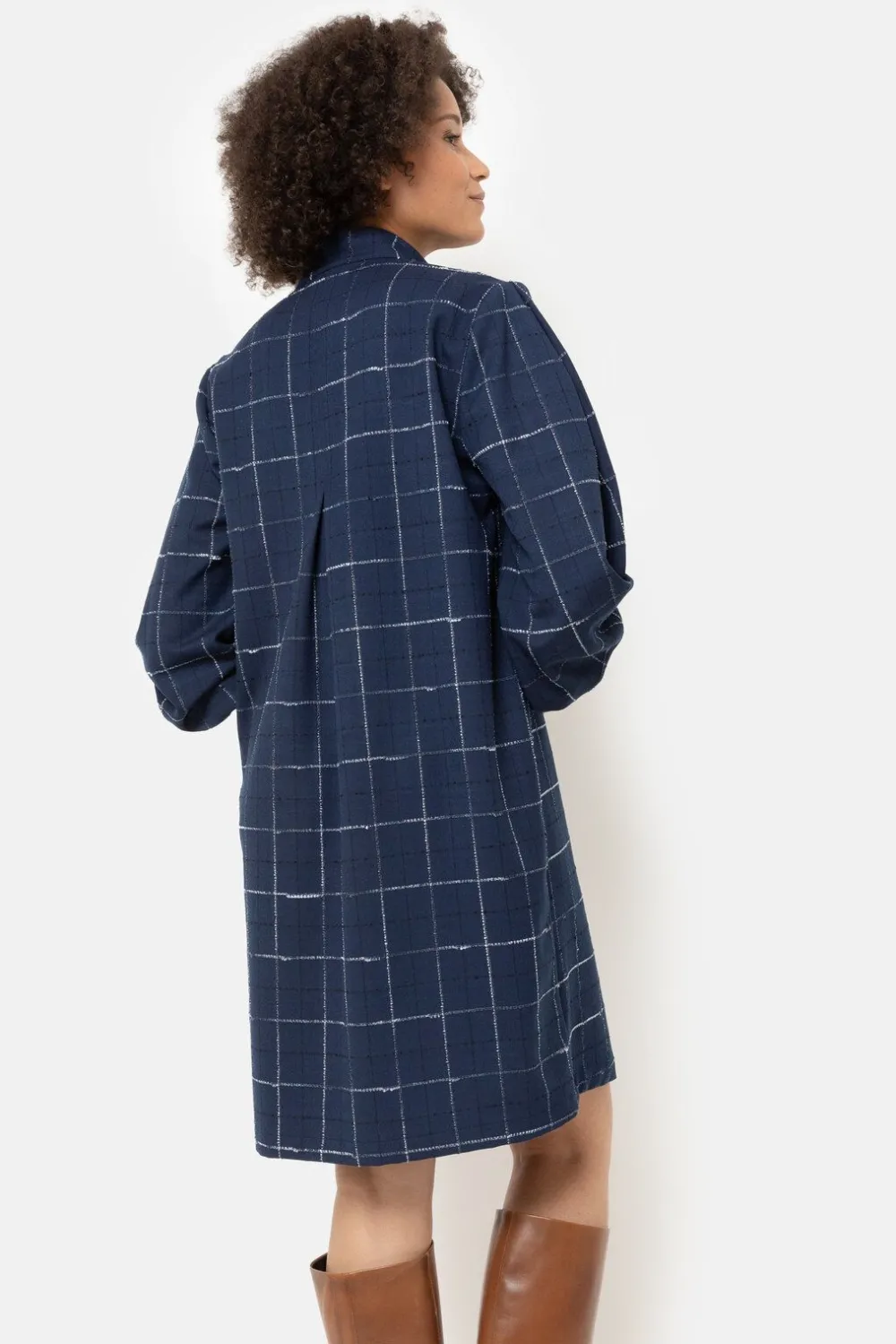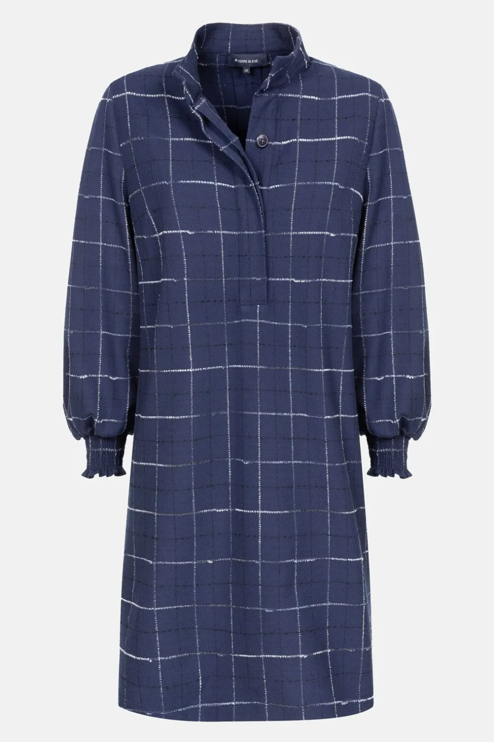 Kort Blauw A-Lijn Kleedje Met Geborduurde Ruiten.Lange Pofmouwen En Een Elegant Opstaand Kraagje.Met Verdoken Knopen Aan…