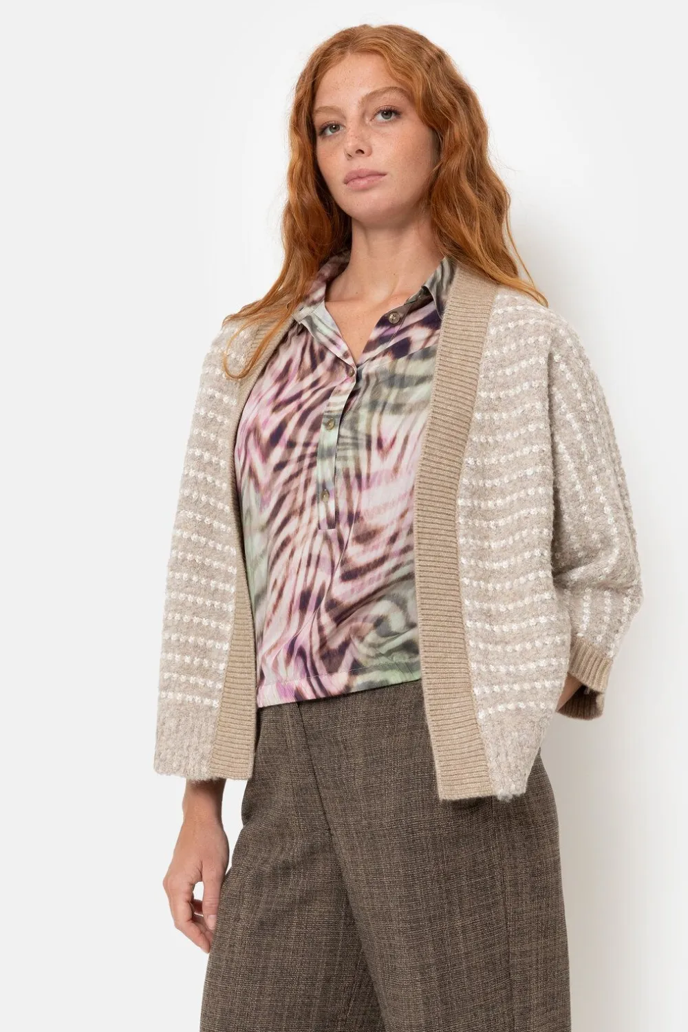 Dames Cardigan In Beige Gestreepte Teddystof.