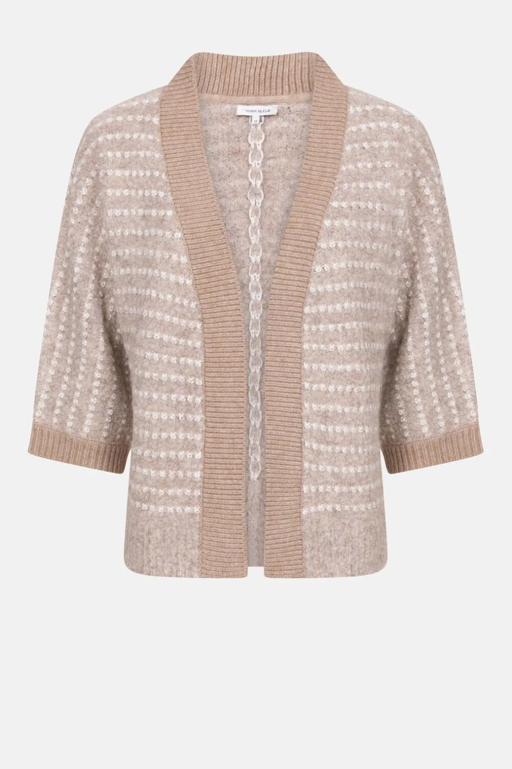 Dames Cardigan In Beige Gestreepte Teddystof.Een Korte, Losjes Vallende Snit Zonder Knopen.Met Effen Kraag, Boorden En M…