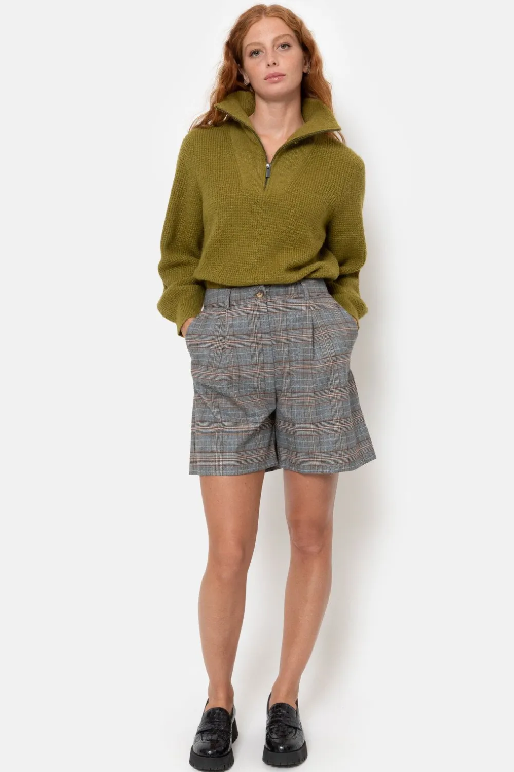 Grijs-Bruin Geruite Short In Een Soepele Viscosemix.Geklede Bermuda Met Een Bandplooi En Wijde Pijpen.Draag Stijlvol Met…