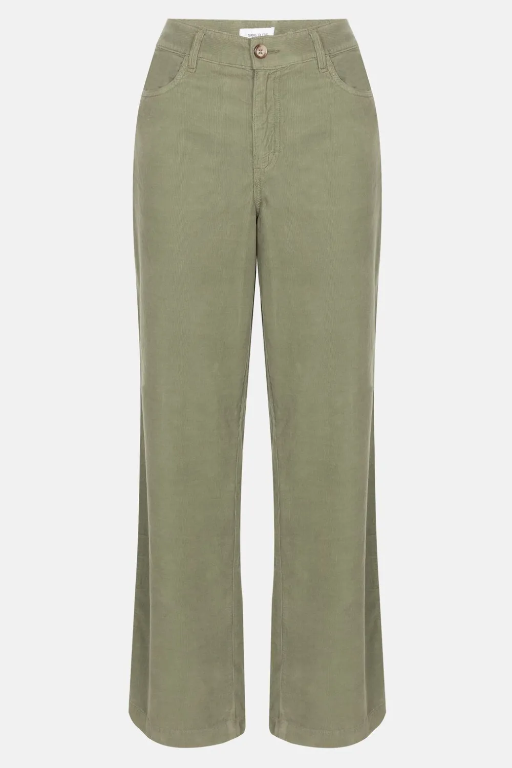 Kaki-Groene Broek In Zeer Fijn Ribfluweel.Met Rechte, Wijdvallende Broekspijpen.En Een Chique Paperbag Taille Met Ingewe…