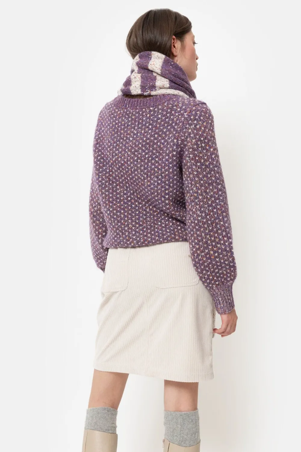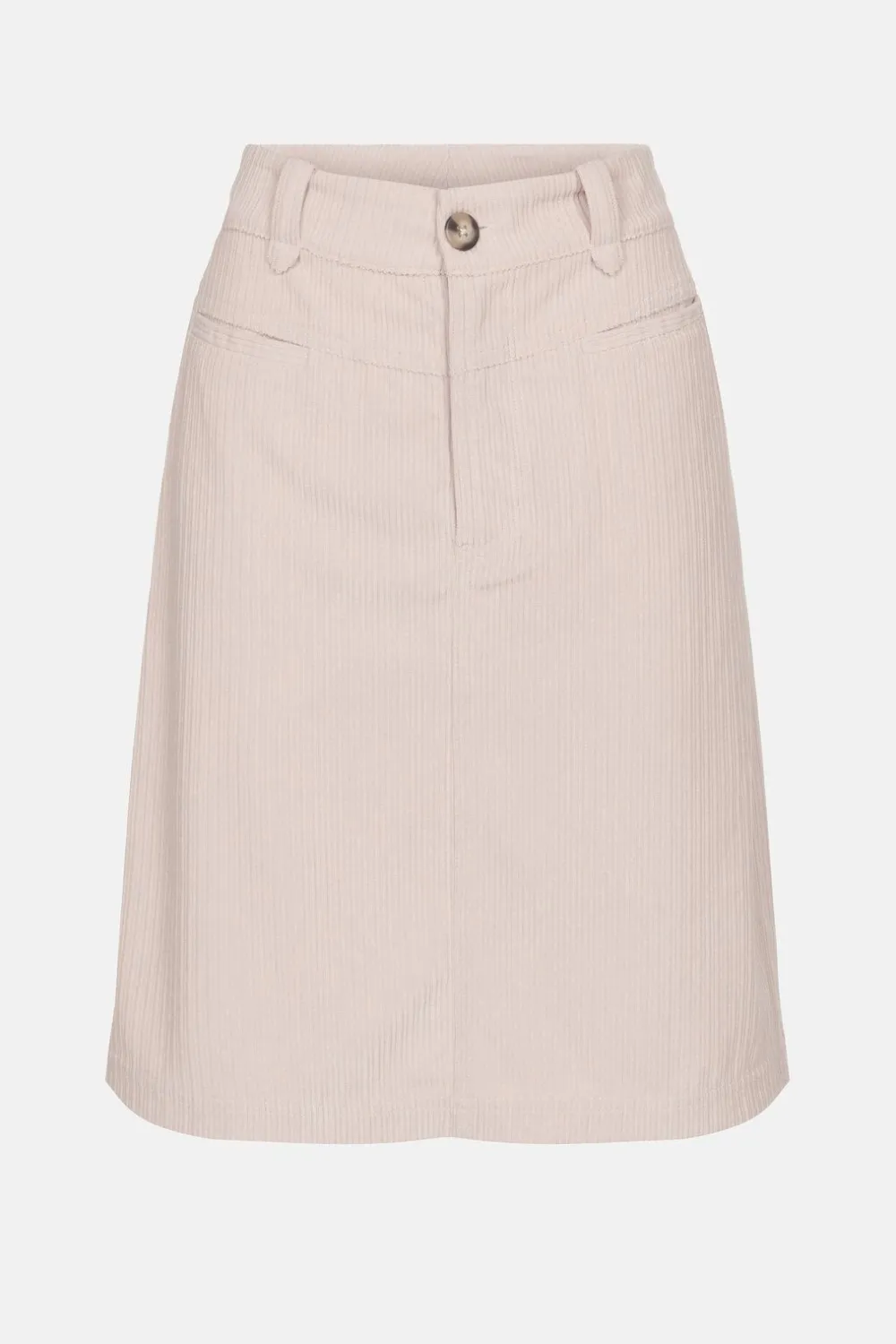 Cremekleurige Rok In Zacht Ribvelours.Een Elegante A-Lijn Snit Met Knielengte.Met Een Enkele Knoop Vooraan En Zakken Op …