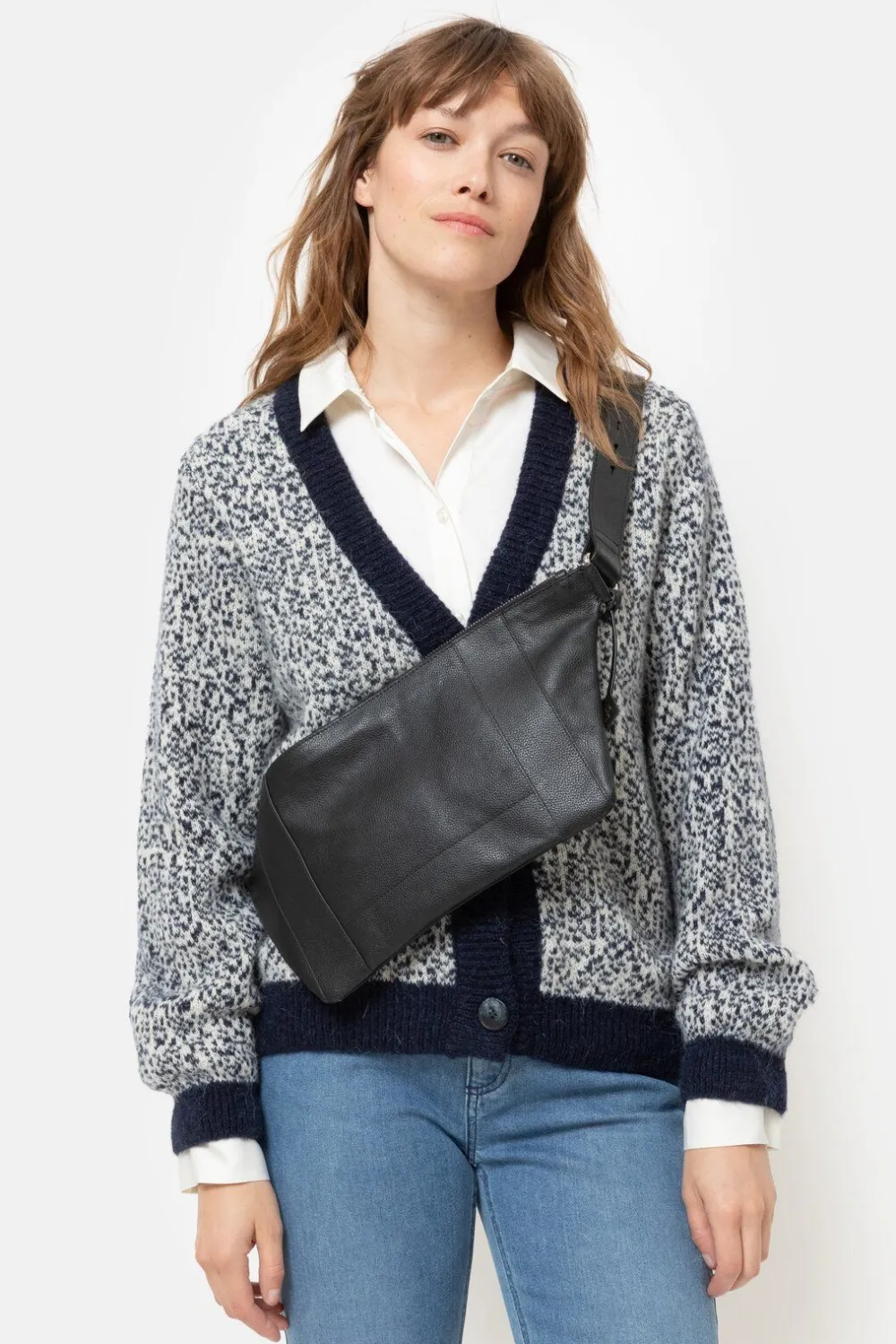 Een Diepe V-Hals En Grote Matblauwe Knopen.