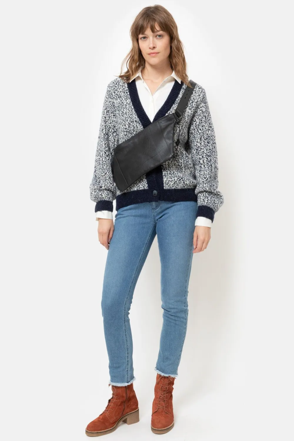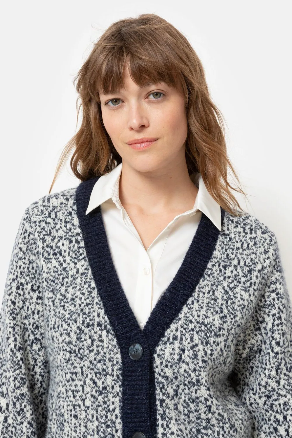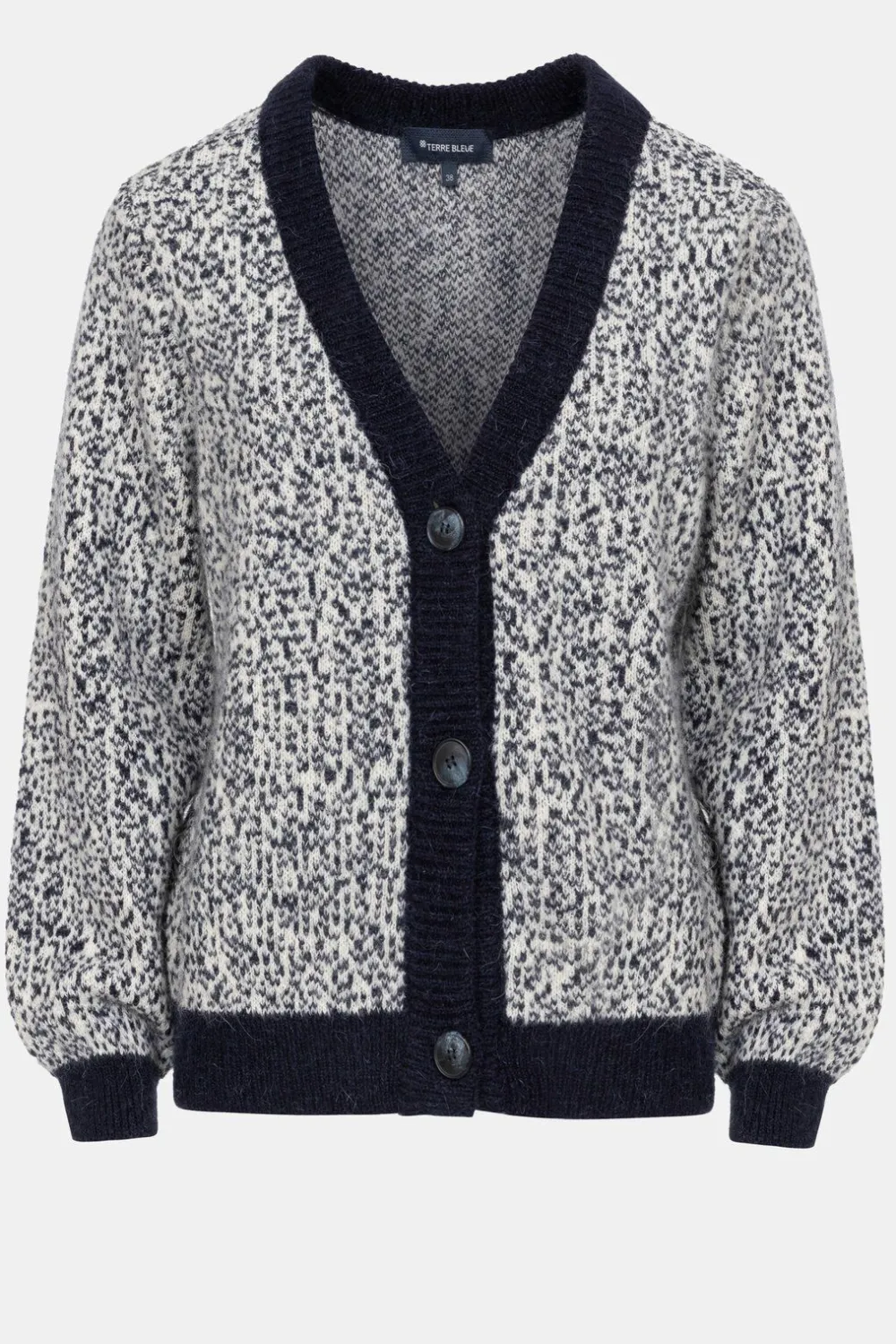 Navy Blauw Gilet Met Een Blauw Gespikkeld Motief.Een Modieuze Boxysnit Met Lange Pofmouwen.Een Diepe V-Hals En Grote Mat…