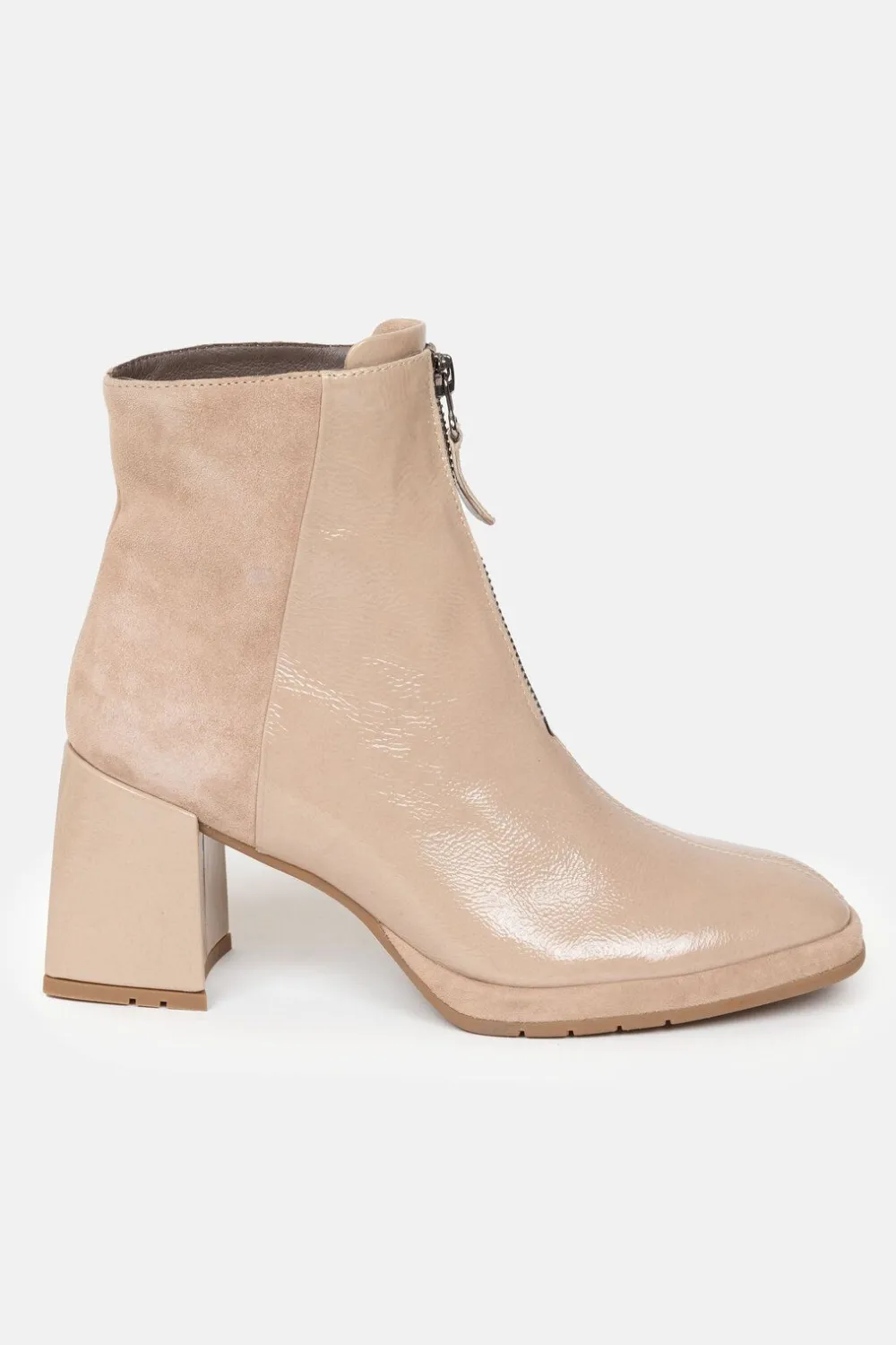 Beige Enkellaarsjes In Lakleder En Suede.Met Een Afgeronde Tip En Zilveren Rits Vooraan.Een Beige Zool En Een Hoge Blokh…