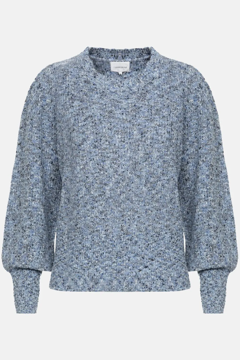 Blauwe Sweater Van Subtiel Meerkleurig Garen.Lange Mouwen Met Brede Manchetten En Pofeffect.Match Stijlvol En Zomers Met…