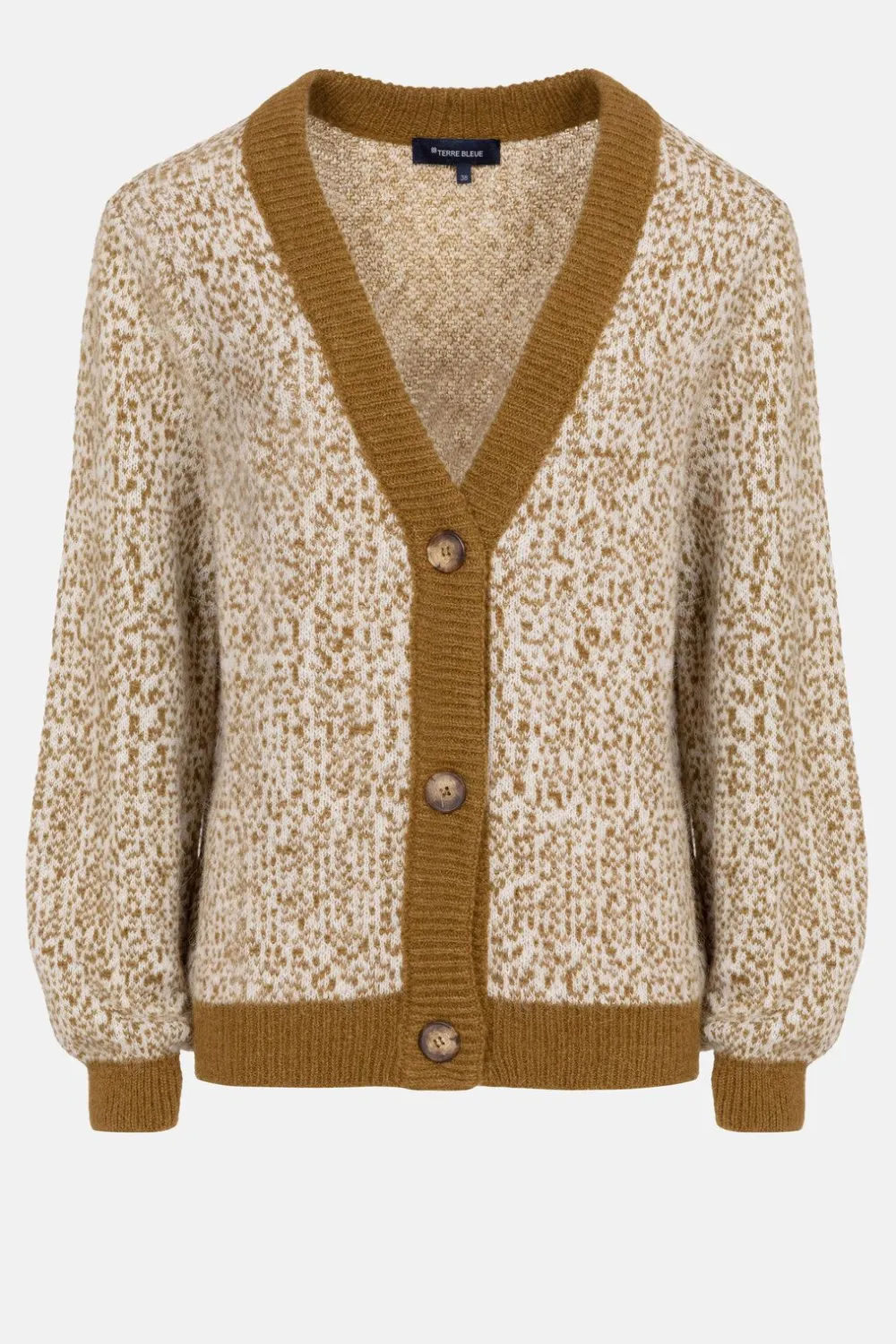Beige Gilet Met Een Olijfgroen Gespikkeld Motief.Een Modieuze Boxysnit Met Lange Pofmouwen.Een Diepe V-Hals En Grote Bru…
