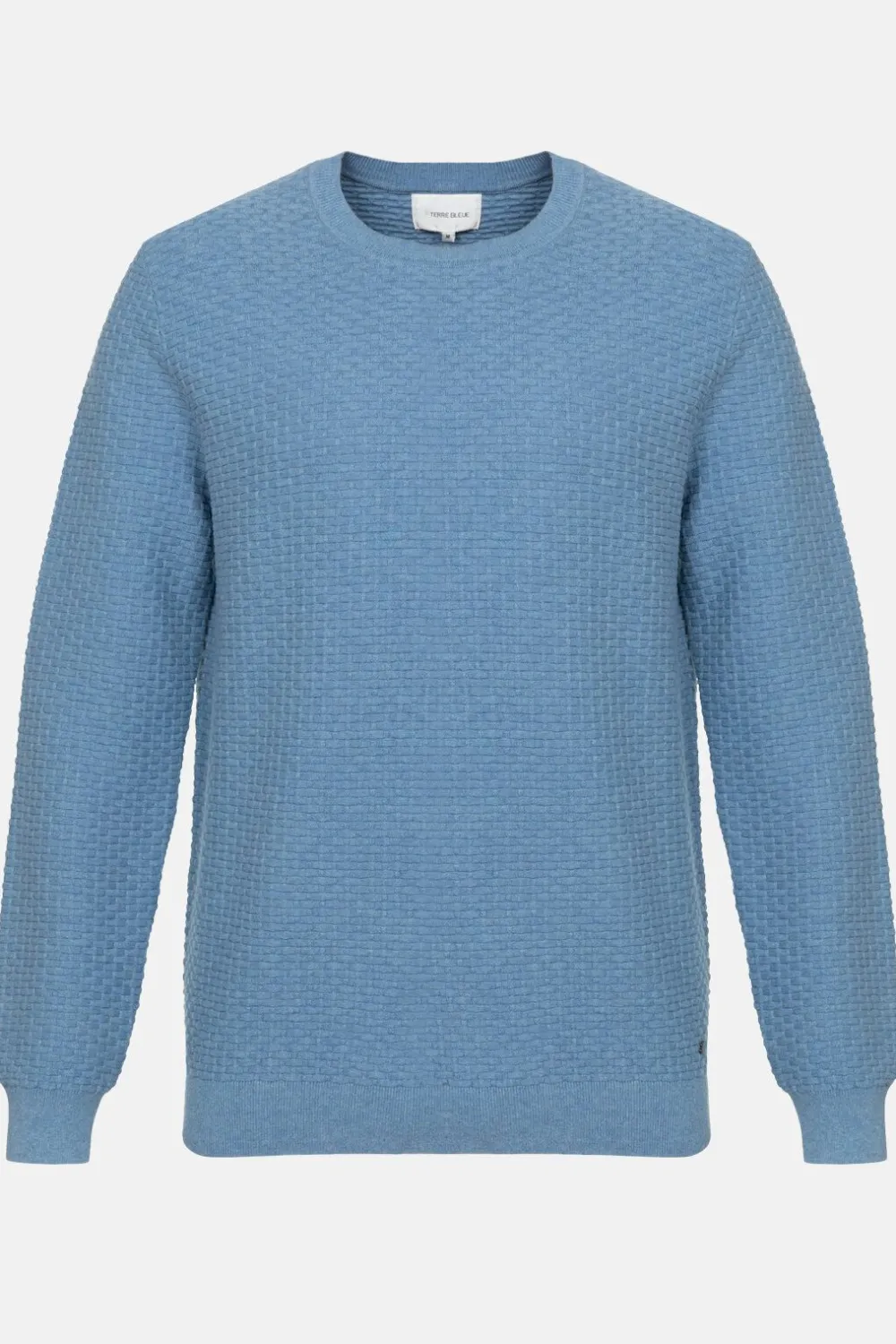 Blauwe Mannen Trui In 100% Katoen.Gebreid Met Een Fijne Bubbelsteek.Een Comfortabele, Losse Fit Met Een Ronde Hals.