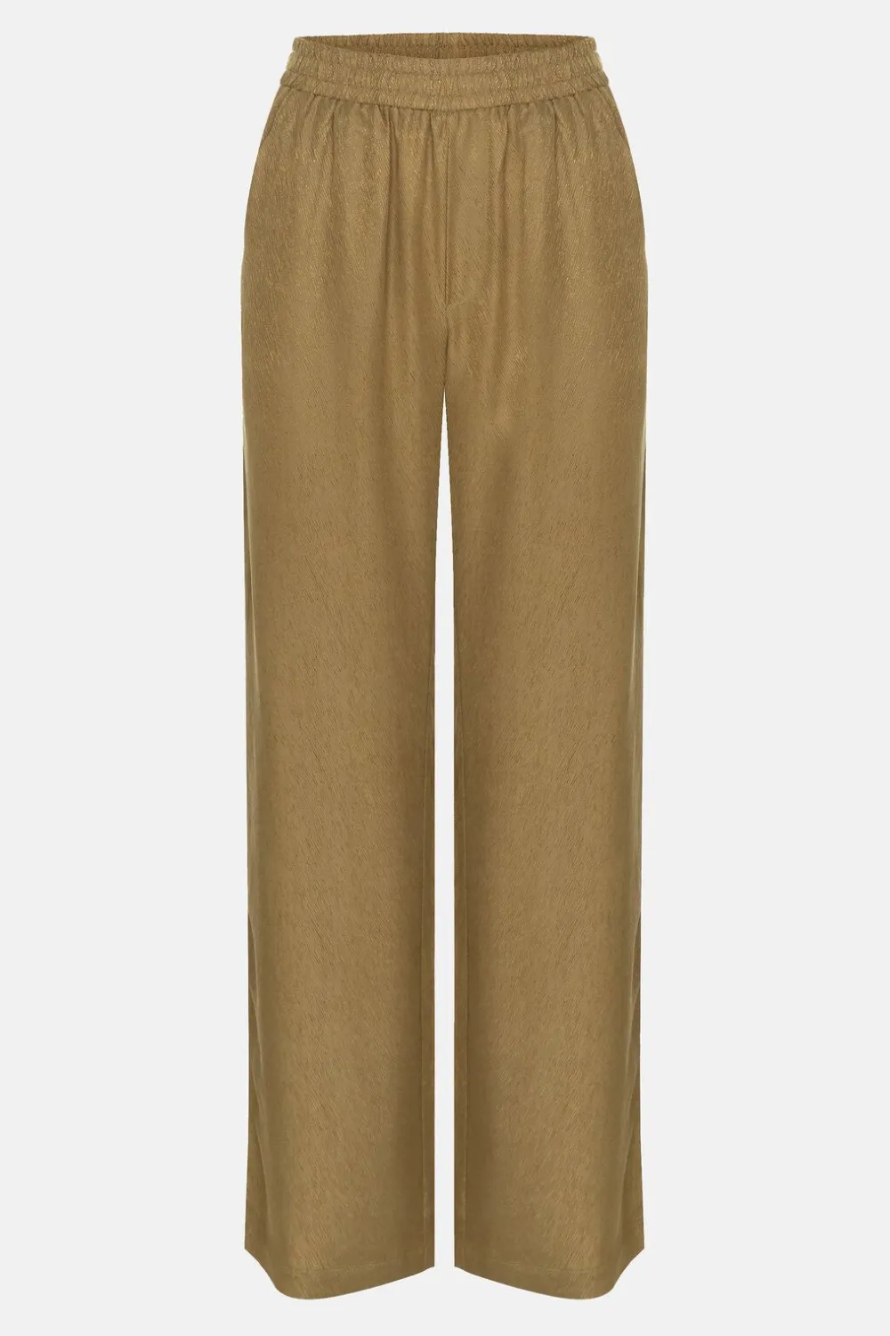 Kaki Groene Damesbroek In Soepel Lyocell En Cupro.Met Heel Fijne, Glanzende Streepjes In De Stof.Een Losse, Zwierige Sni…