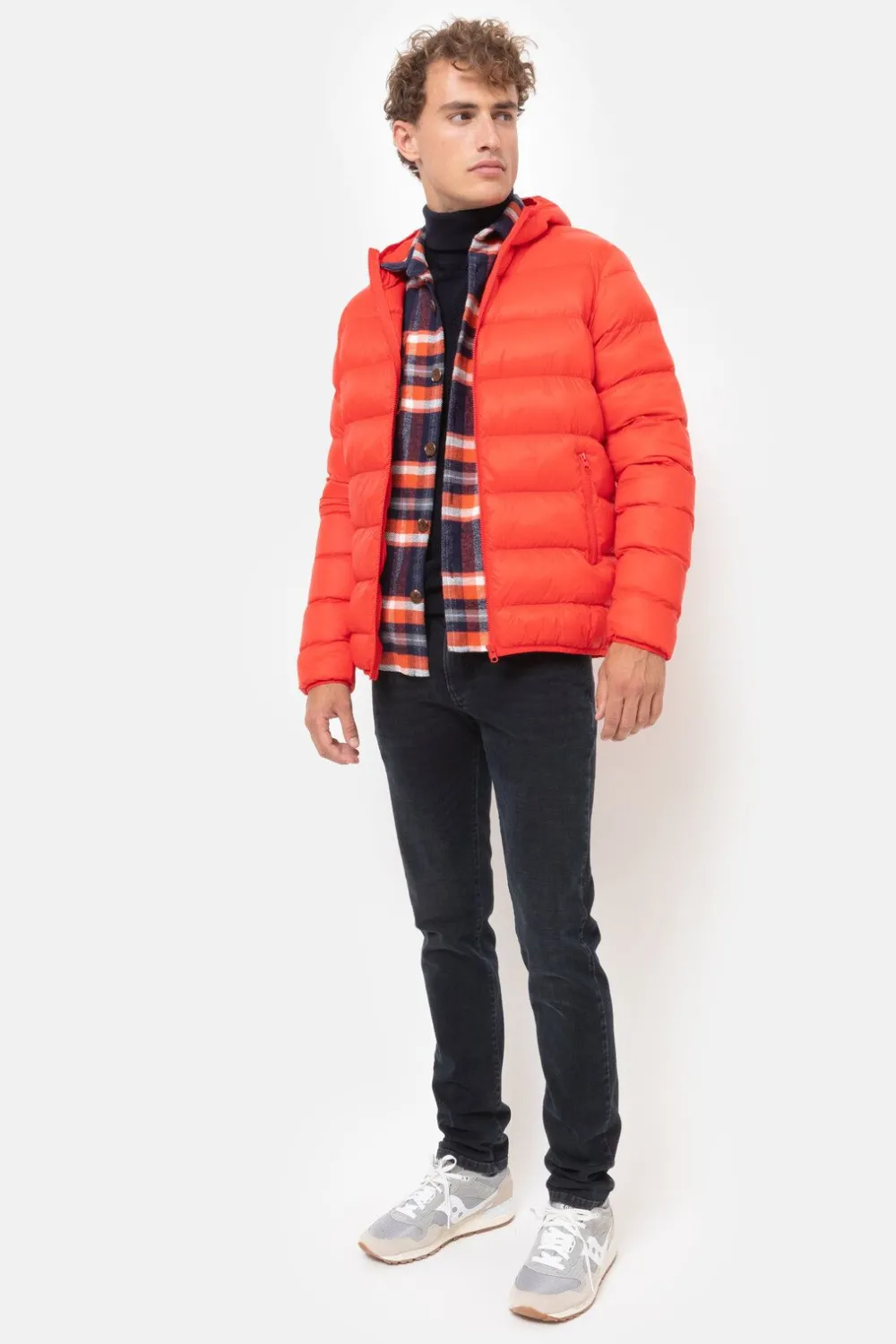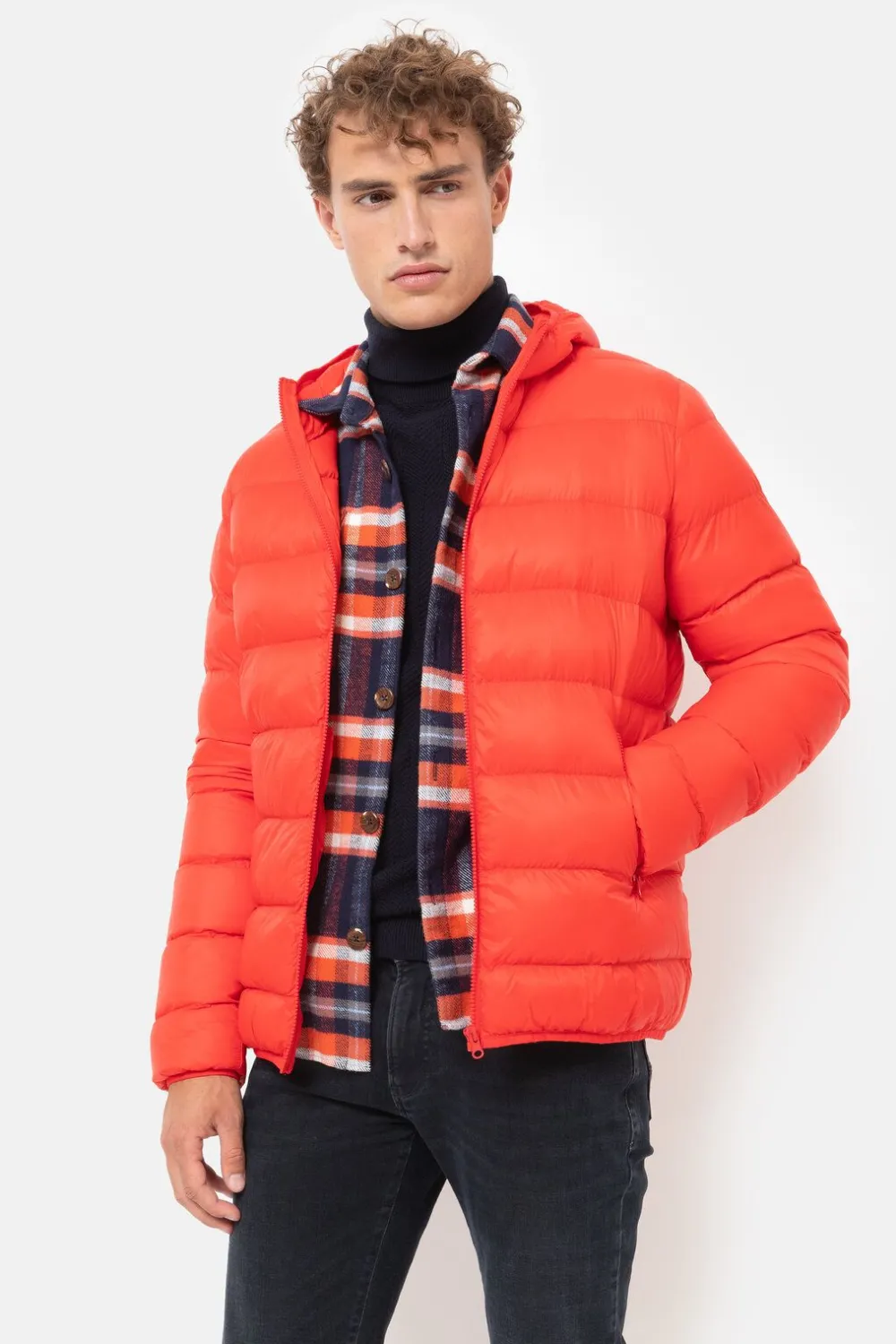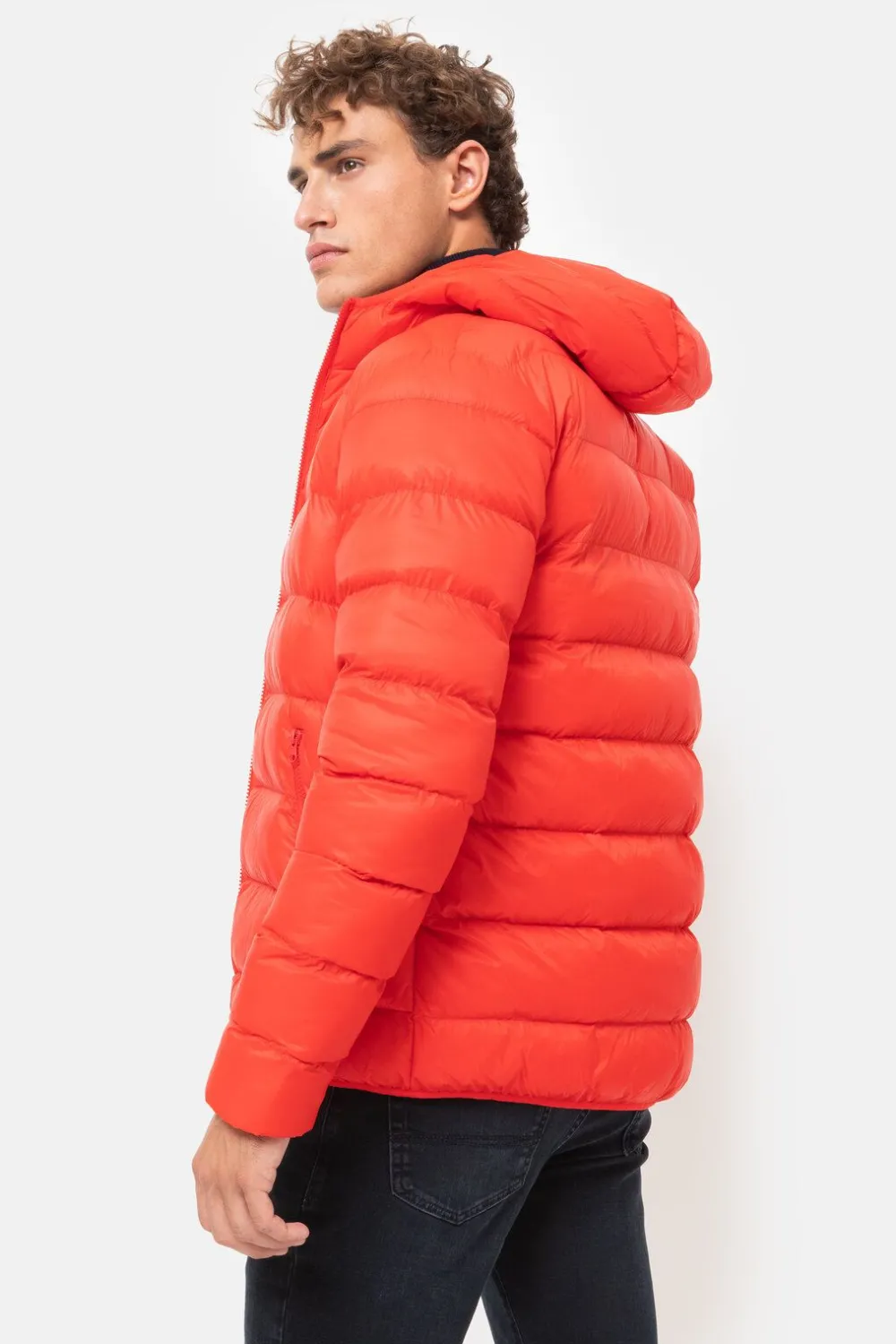 Gewatteerde Felrode Winterjas Voor Mannen.Een Korte Fit Met Een Smalle Elastiek Onderaan.Met Een Gewatteerde Kap En Zijz…
