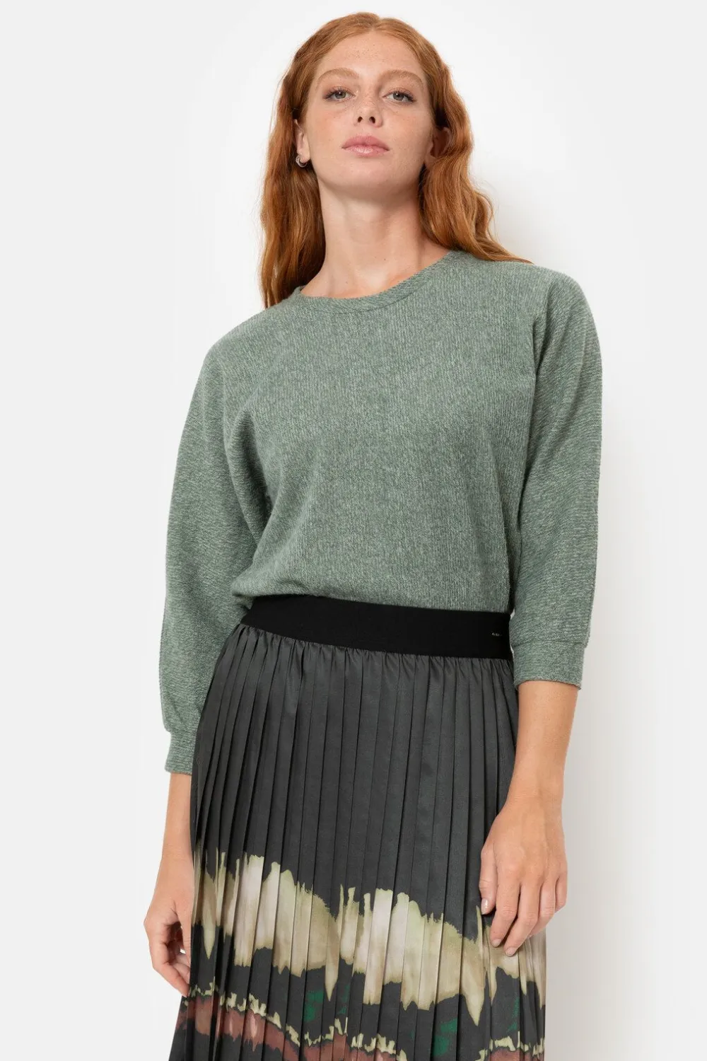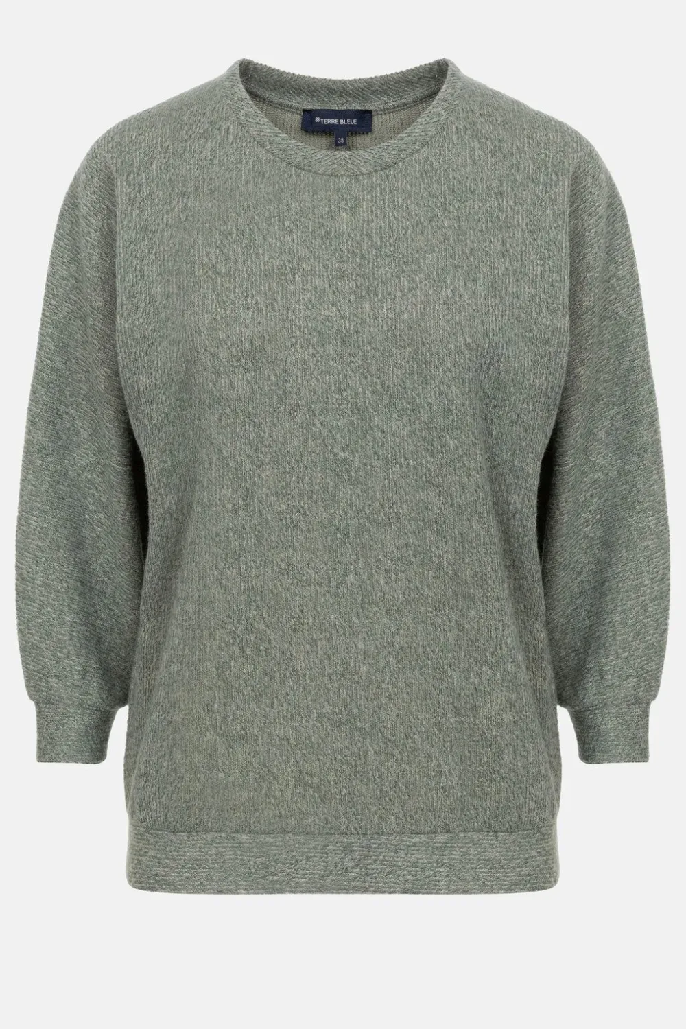 Fijn Gebreide Groene Damespull In Zachte Stof.Een Korte, Wijdere Snit Met Een Elastiek Onderaan.Een Ronde Hals, Lange Mo…