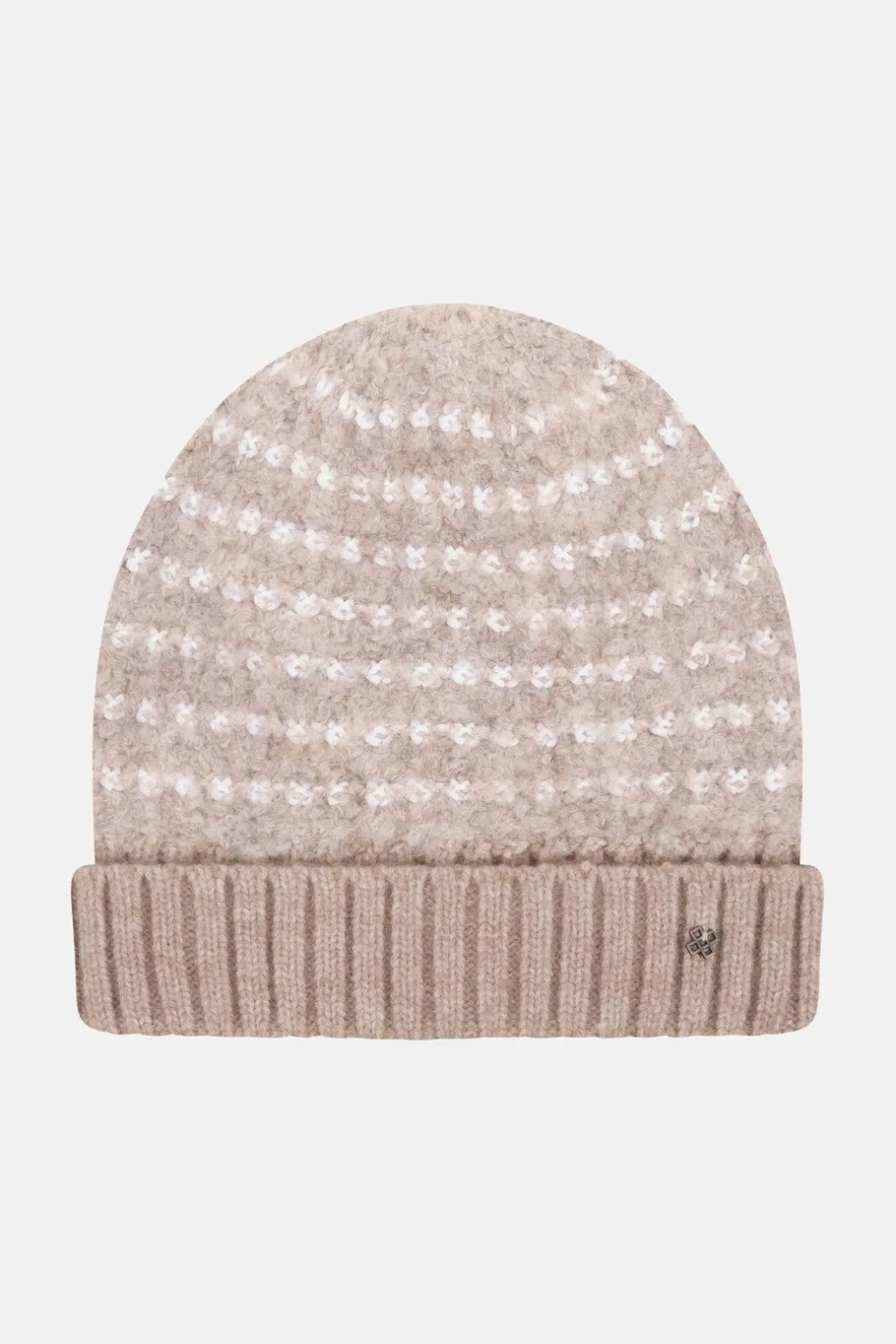 Donkerbeige Muts In O.A. Gerecycleerd Polyester.Met Gebreide Witte Strepen En Een Effen Omslag.Match Met De Beige Teddy …