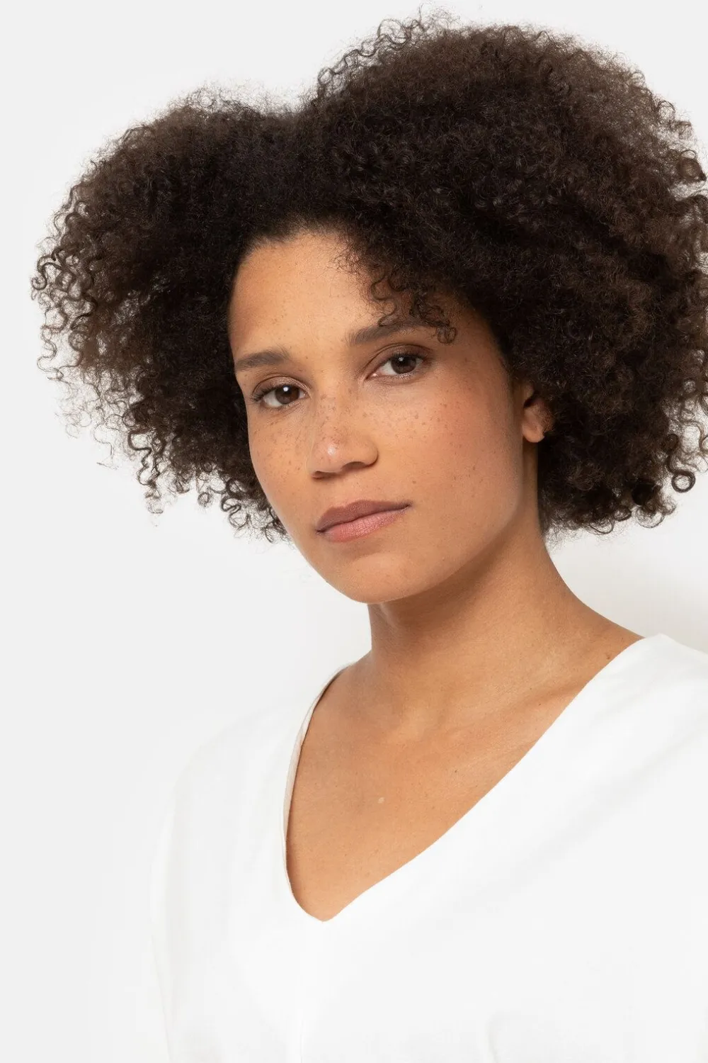 Witte Top In Een Zachte Mix Van Modal En Biokatoen.Een Korte, Wijdere Snit Met Een Elegante V-Hals.En Lage Schouders Met…