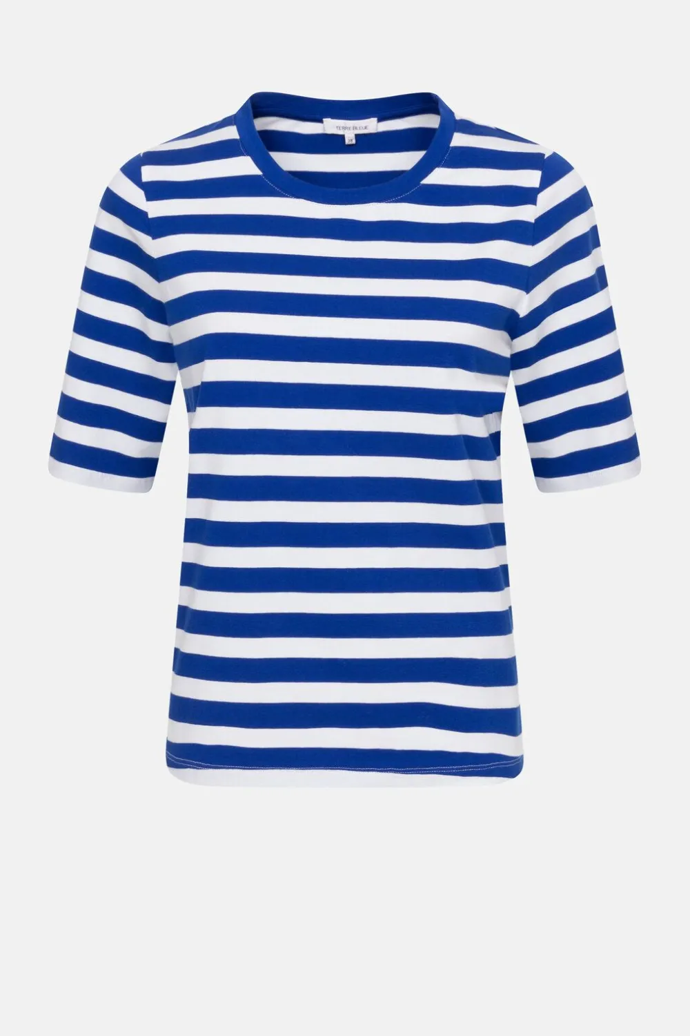 Ecru-Blauw Gestreept Shirt In Katoen Met Stretch.Met Korte Mouwen En Een Wijde Ronde Hals.Match Modieus Met Een Blauwe J…