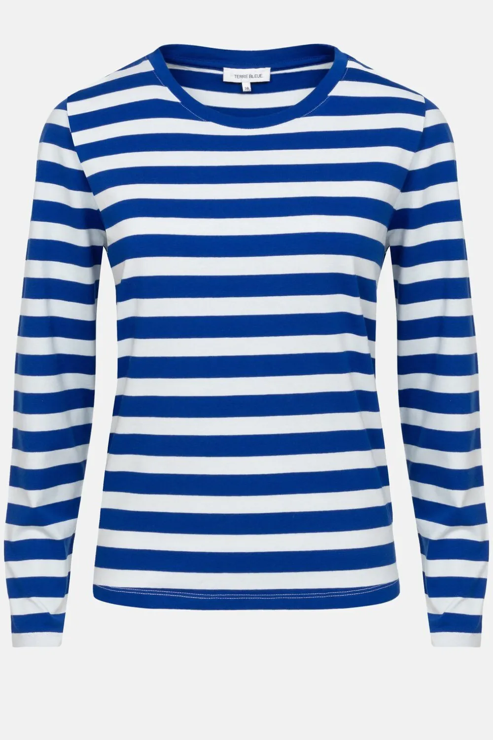 Ecru-Blauw Gestreepte Top In Katoen Met Stretch.