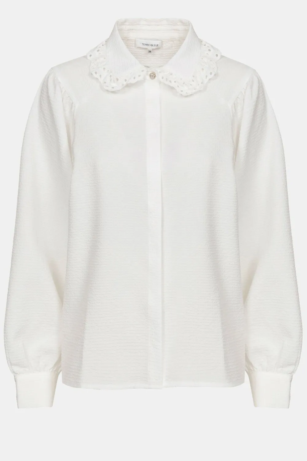 Met Broderie En Een Strassknoopje Aan De Kraag.